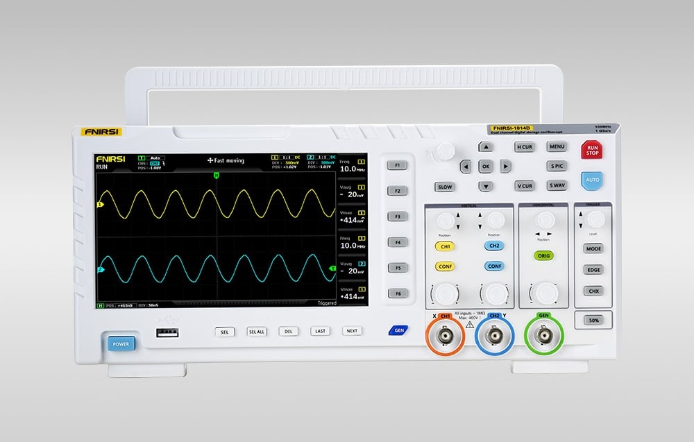 Az FNIRSI 1014D egy kompakt digitális oszcilloszkóp, amelyet elektronikus szervizek, kutatási és fejlesztési részlegek, műszaki oktatás és hobbisták számára terveztek. Lehetővé teszi az egyidejű elemzést és jelgenerálást, ami jelentősen megnöveli az alkalmazási lehetőségeket áramkörök diagnosztizálásakor, prototípusok tesztelésekor vagy a hullámformákkal való munka megtanulásakor. A készülék két bemeneti csatornával rendelkezik 1 MΩ impedanciával, és 100 MHz sávszélességet támogat 1GSa/s mintavételezés mellett. A kezelést egy 7 hüvelykes, 800×480 px felbontású LCD-képernyő könnyíti meg. Lehetőség van automatikus elemzésre, FFT, X-Y módra és kurzoros felvételre. A készülék 1 GB-os belső memóriával rendelkezik, amely akár 1000 hullámforma és 1000 képernyőkép tárolására is alkalmas, és az adatok USB-n keresztül könnyen exportálhatók számítógépre.