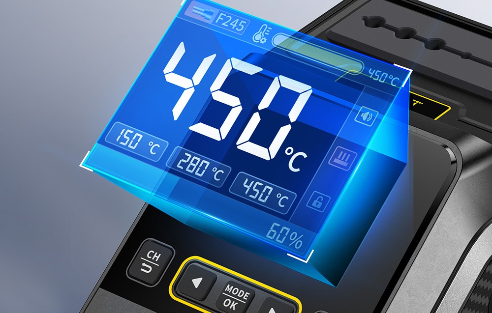 Széles körű kompatibilitás és teljesítménystabilitás Az állomás támogatja az F210 és F245 tartókat is - könnyedén válthat közöttük az adott munkától függően. A széles feszültségtartománynak (100-240V) és a tiszta réz transzformátornak köszönhetően az egység stabilan működik a legkülönbözőbb áramellátási körülmények között, így ideális választás a felhasználók számára világszerte. Az intelligens PID-rendszer stabil hőmérséklet-szabályozást tesz lehetővé 100°C és 450°C között. Az állomás gyors fűtési (mindössze 1 másodperc) és olvadási (3 másodperc) idővel is rendelkezik, emellett akár 200 W-os teljesítményt kínál a még pontosabb működés érdekében.