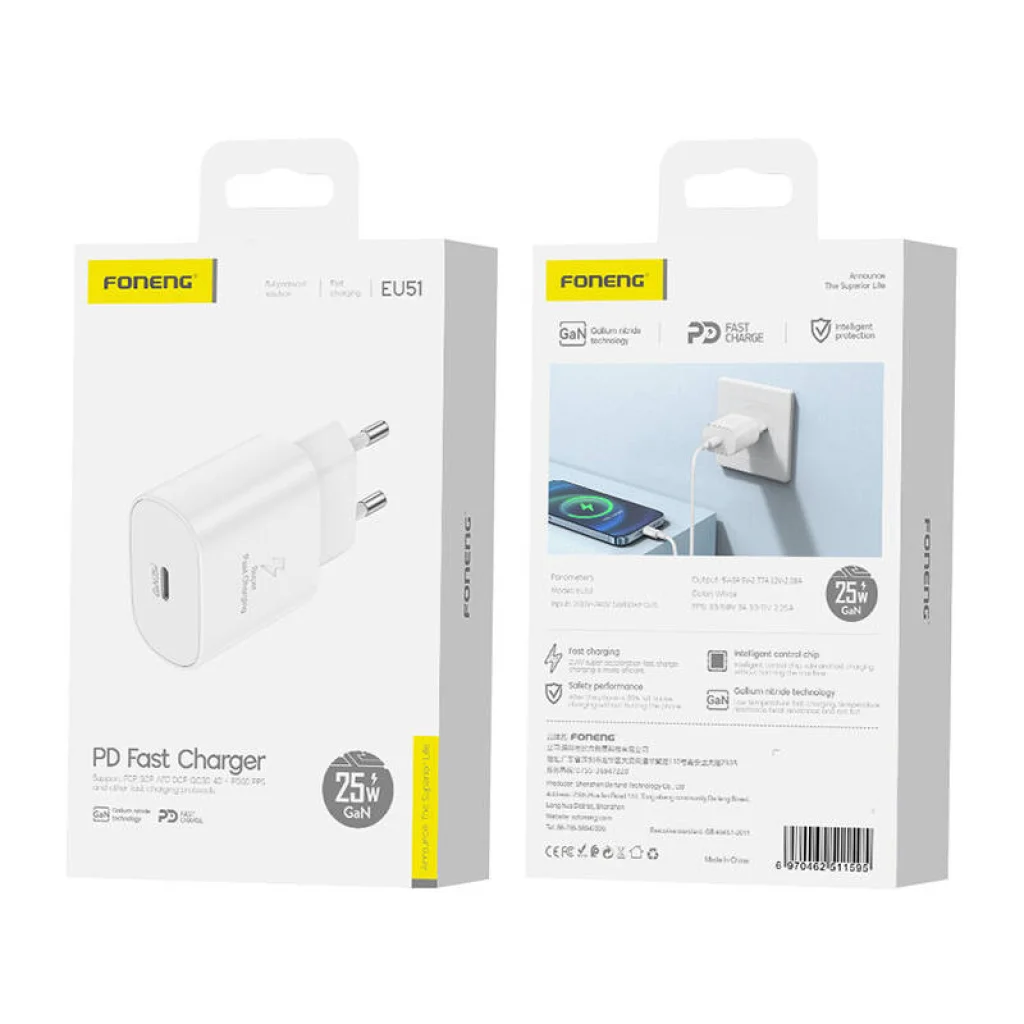 A Foneng EU51 USB-C 25W hálózati töltő egy erős és sokoldalú megoldás azok számára, akik gyors töltésre vágynak. A GaN (gallium-nitrid) technológiával akár 25W teljesítményt is nyújt, amely lehetővé teszi, hogy telefonodat akár 60%-ra töltsd mindössze 30 perc alatt. Többféle gyors töltési protokollt támogat, beleértve a Samsung PPS, FCP, SCP, AFC, DCP, QC2.0/3.0/4.0 és PD3.0, így számos eszközzel, köztük az IP8-tól IP15-ig terjedő okostelefonokkal is kompatibilis. A töltő három különböző típusú adapterrel (EU/UK/US) rendelkezik, így ideális a világ körüli utazásokhoz. A fejlett GaN chip állandó hőmérsékletet tart fenn, még intenzív használat során is biztonságos töltést garantálva. Ezen kívül a beépített védelem megóv a túlfeszültségtől, túlmelegedéstől és túlterheléstől. Egy gyors töltőkábellel is jár, amely tovább gyorsítja a töltési folyamatot.