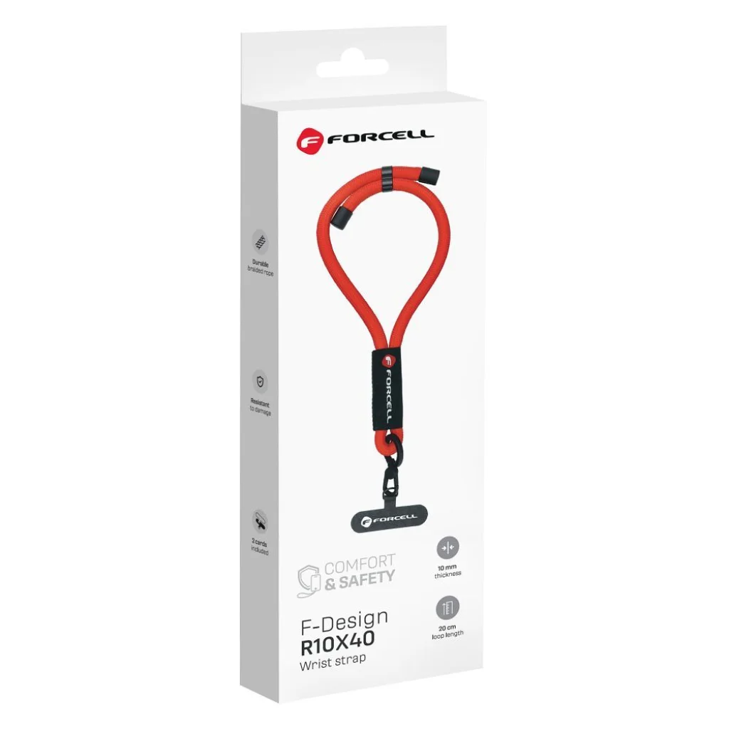 Az állítható hurokhossznak köszönhetően (maximum 20 cm) a FORCELL F-DESIGN R10X40 csuklópánt kényelmesen illeszkedik minden csuklóméretre. A rögzítés rendkívül egyszerű: mindössze be kell helyeznie az egyik mellékelt műanyag kártyát a telefontok és a telefon közé, majd a pántot hozzá kell csatlakoztatni.