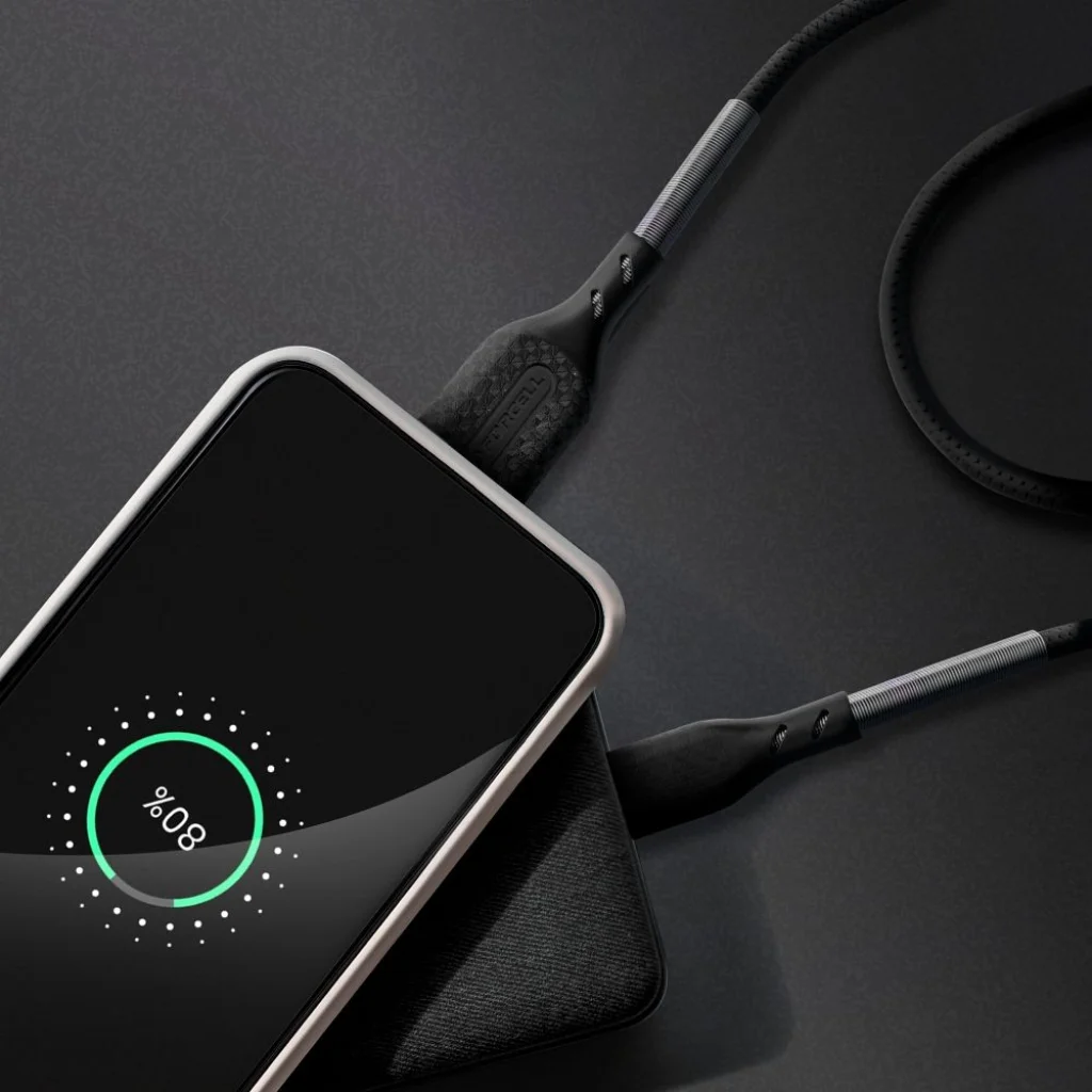 A kábel tartós nejlon fonott burkolattal és fémmegerősítéssel készült, ellenáll a kopásnak és szakadásnak.