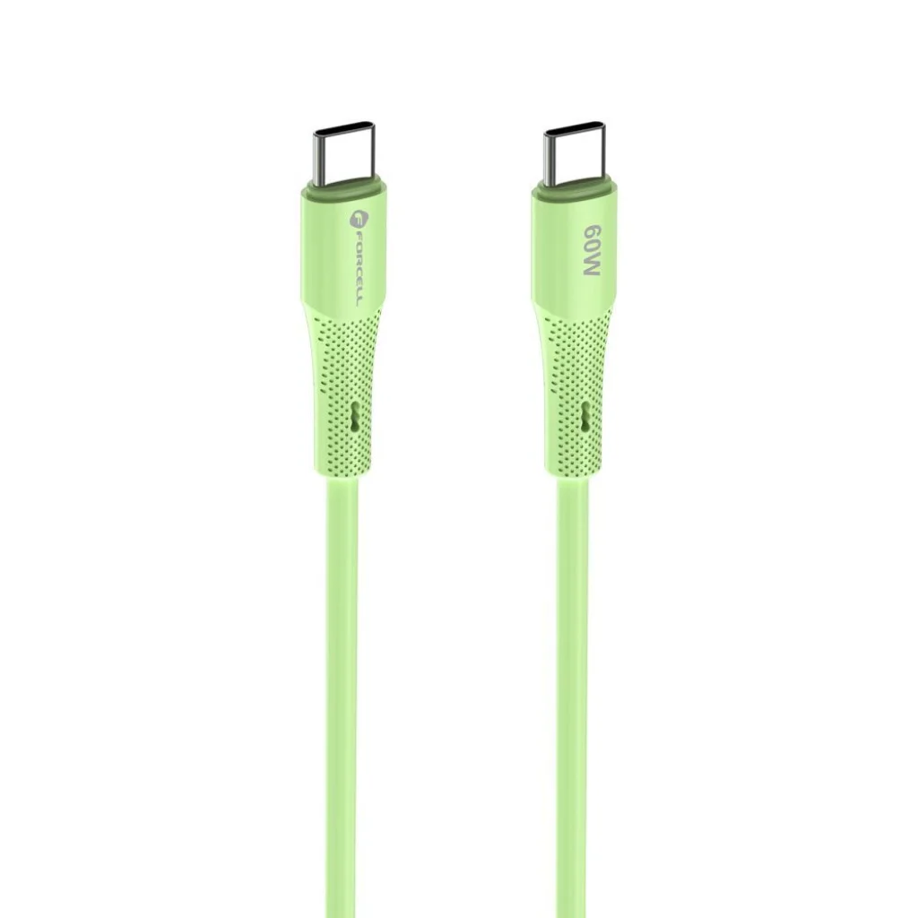 Univerzális USB-C kábel 60 W nagy teljesítménnyel, amely lehetővé teszi az okostelefonok, táblagépek és laptopok gyors és biztonságos töltését. Puha, rugalmas szilikonból készült, amely megakadályozza a gubancolódást, és egyedi textúrája növeli a használati kényelmet.