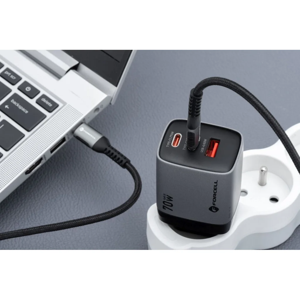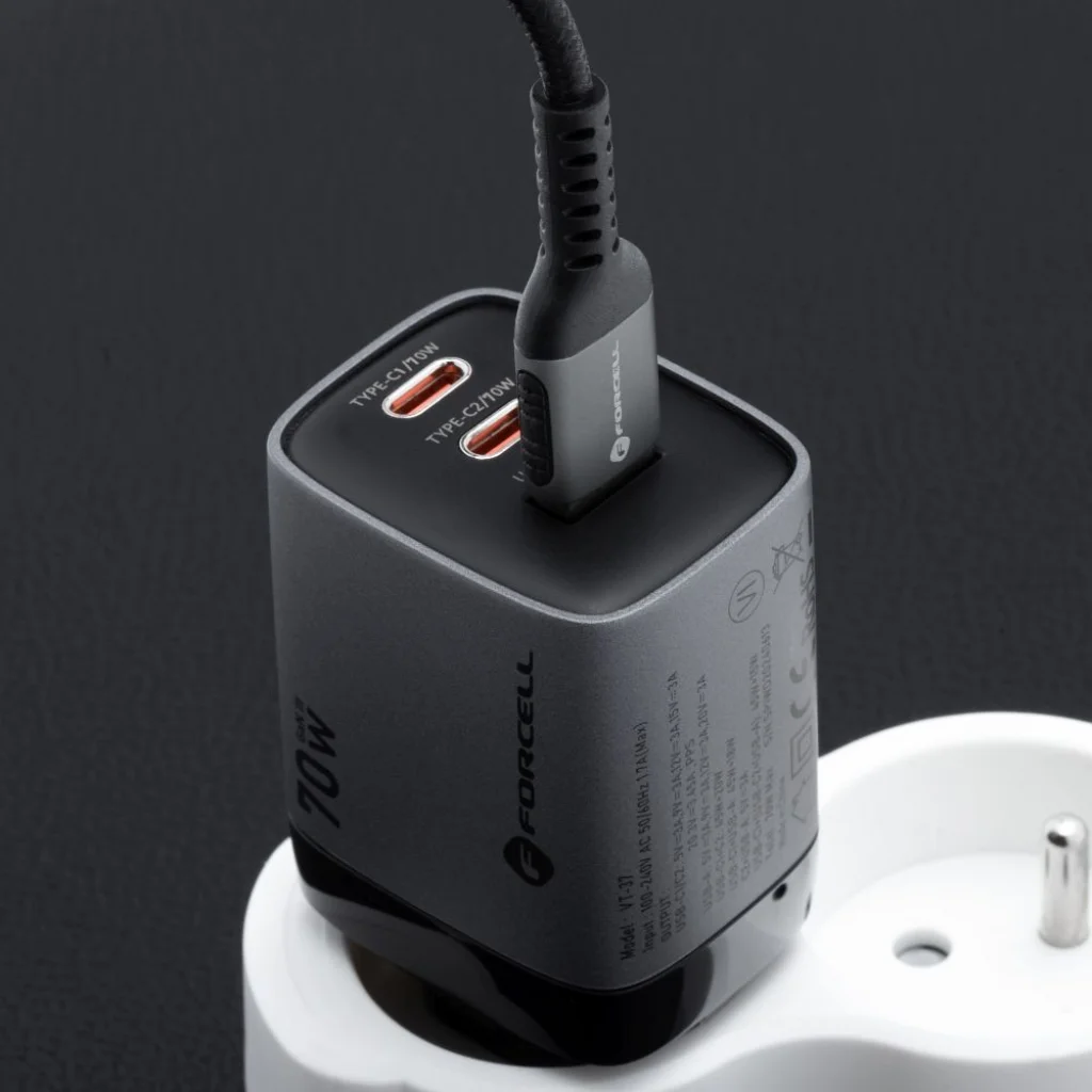 A 70 W-os fali töltő teljes mértékben megfelel a CE, LVD és RoHS szabványoknak, és egy speciális áramkör védi a túlmelegedés és feszültségingadozások ellen. 70 W-os fali töltő három porttal: 2x USB-C és 1x USB-A