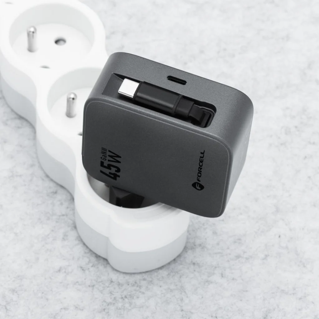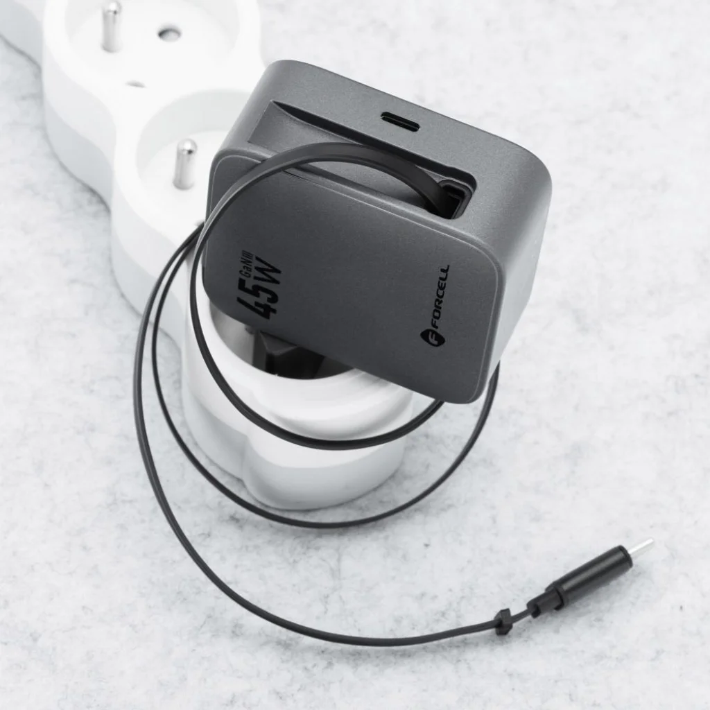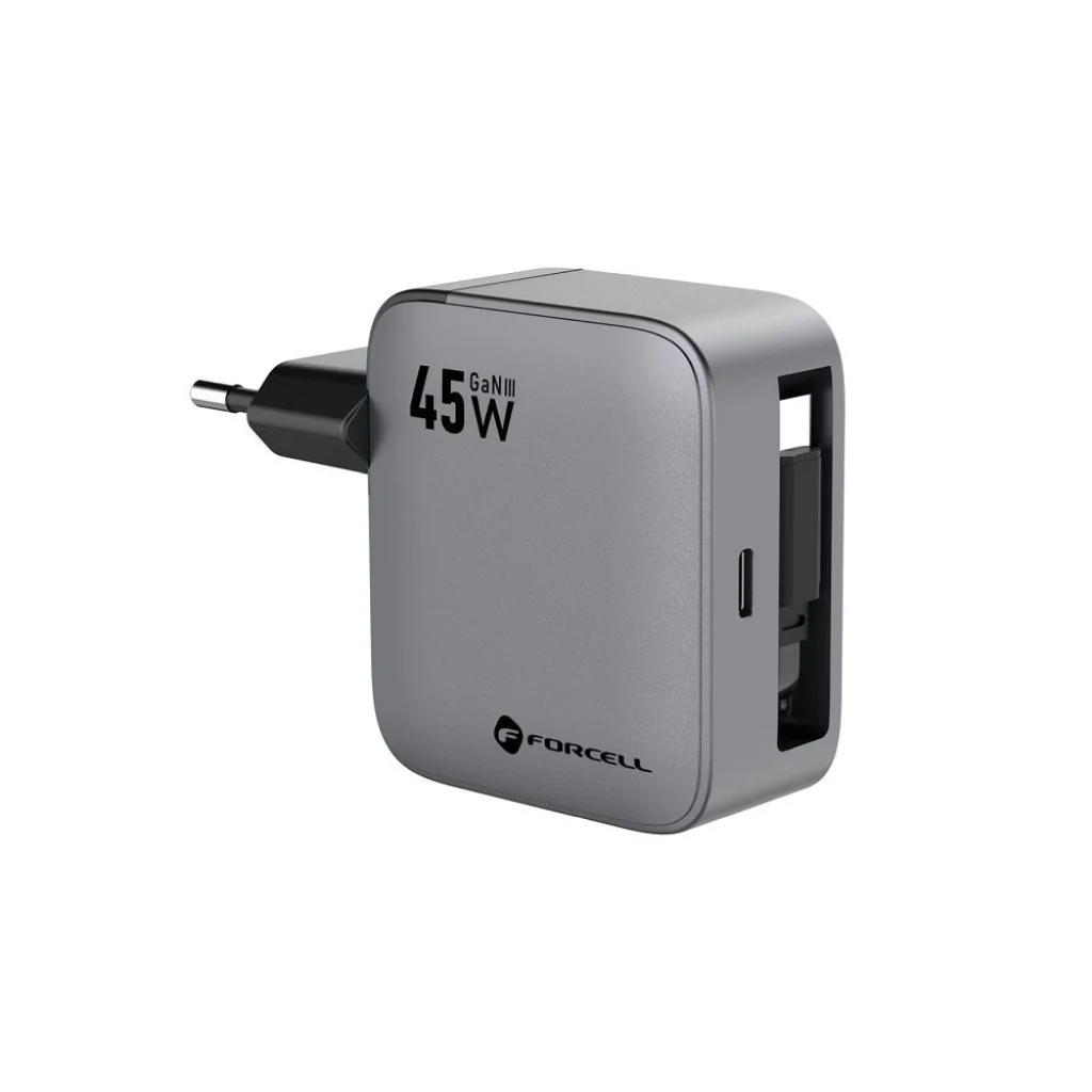 Fedezze fel a FORCELL F-ENERGY GaN III VT-R5 utazótöltőt, amely a modern töltési technológia csúcsát képviseli. Ez a 45 W-os fali töltő nem csupán egy USB-C porttal, hanem egy praktikus, visszahúzható USB-C kábellel is rendelkezik, így két eszköz egyidejű, szupergyors töltését teszi lehetővé. Ideális választás azoknak, akik a maximális teljesítményt, kényelmet és hordozhatóságot keresik utazásaik vagy mindennapi használat során.