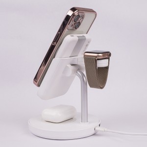 A MACS-100 mágneses vezeték nélküli töltőállomás power bankkal fehér 5in1 egy sokoldalú töltő, amely lehetővé teszi 3 eszköz egyidejű töltését. A MagSafe és a vezeték nélküli töltést támogató telefonokkal való kompatibilitása zökkenőmentes töltést biztosít a különböző eszközmodellek számára. Beépített USB-A porttal is rendelkezik.