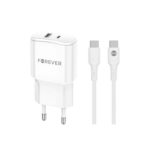 Gyors töltés Power Delivery-vel. A Forever TC-01 fali töltő egy új generációs termék, amely kommunikál a töltött okostelefonnal. Az eszköz teljesen biztonságos az akkumulátor számára az intelligens tápegységnek köszönhetően. A gyors töltés ma már elengedhetetlen. A Forever TC-01 fali töltő Power Delivery rendszert tartalmaz, amelyet vezető márkák, mint az Apple vagy a Samsung támogatnak. Két porttal van felszerelve: USB és USB-C, lehetővé téve két eszköz egyidejű töltését. A készlet tartalmaz egy USB-C-ről USB-C-re kábel.