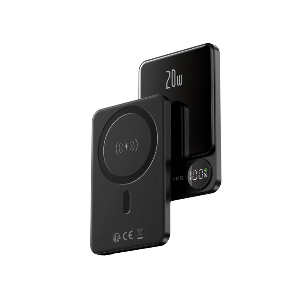 A power bank lehetővé teszi két eszköz egyidejű töltését, és a telefonhoz való mágneses rögzítés biztosítja a stabilitást a vezeték nélküli töltés során.