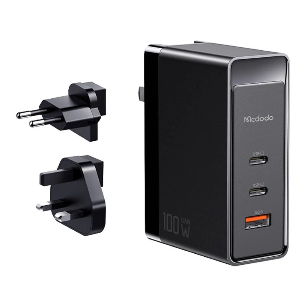 GaN Mcdodo CH-8101 Pro univerzális UK/US/EU utazó töltő/adapter, 100W, 2xUSB-C, USB-A (fekete)