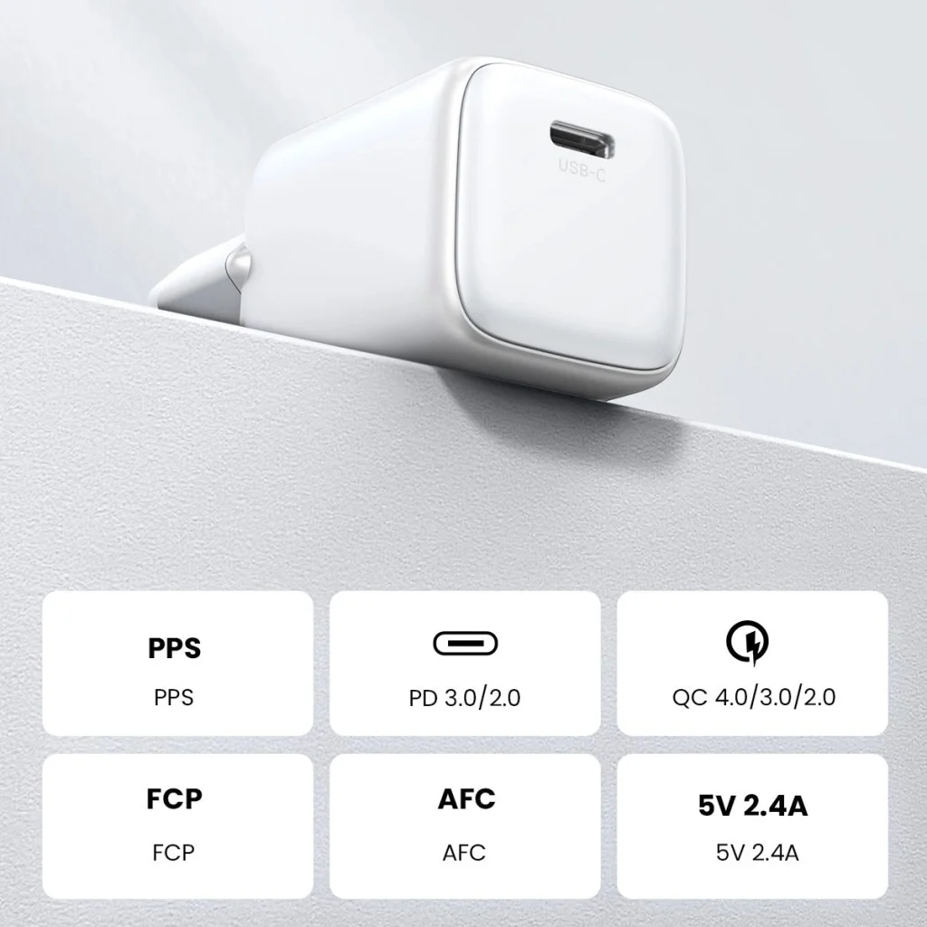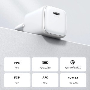 GaN USB C 30W PD Ugreen Nexode Mini gyors töltő - fehér A Ugreen márka töltőjét GaN technológiával gyártották. Ez jobb alternatívája a szilíciumnak, ami által a töltő kisebb méretű. A CD319 modell képes nagyon rövid időn belül feltölteni készülékeid, így ideális választás irodai vagy otthoni munkavégzéshez. A töltő teljesítménye 30W. A töltő támogatja a gyors töltési protokollokat, beleértve: Power Delivery, Quick Charge, Programmable Power Supply, amely egyúttal biztonságos használatot biztosít, minimalizálva a rövidzárlat vagy a túlmelegedés kockázatát. Biztos lehetsz benne, hogy a töltő a készülék szükségleteihez igazítja az áramerősséget, optimalizálva a töltési folyamatot és csökkentve az energia veszteséget. Specifikáció: - Márka: Ugreen - Modell: CD319 - Anyag: tűzálló PC - Töltési kompatibilitás: - Programmable Power Supply - Power Delivery 2.0 / 3.0 - Quick Charge 2.0 / 3.0 / 4.0 - AFC - SCPs - FCP - BC1.2 (5V/1.5A) - Tápellátás (bemenet): 100-240V / 50-60Hz / 0.8A - Teljesítmény (kimenet): USB C 5V / 3A, 9V / 3A, 12V / 2.5A, 15V / 2A, 20V / 1.5A, 3.3-11V / 2.7A - Teljes teljesítmény: 30W - Méretek: 32x32x58mm - Súly: kb. 50g