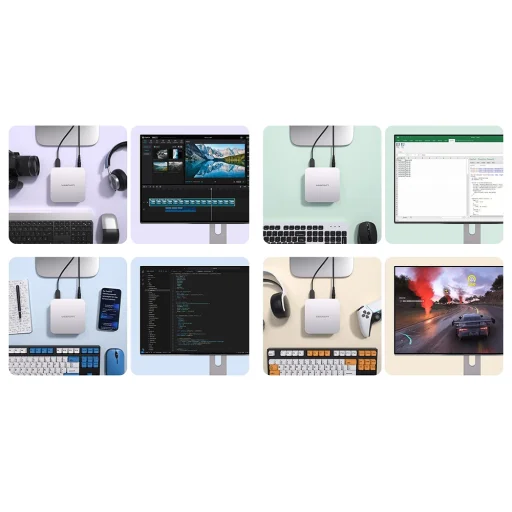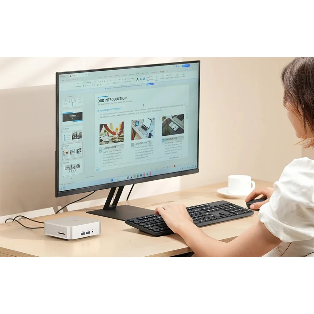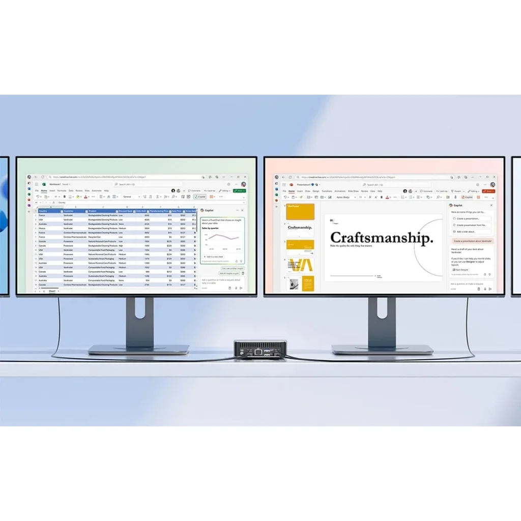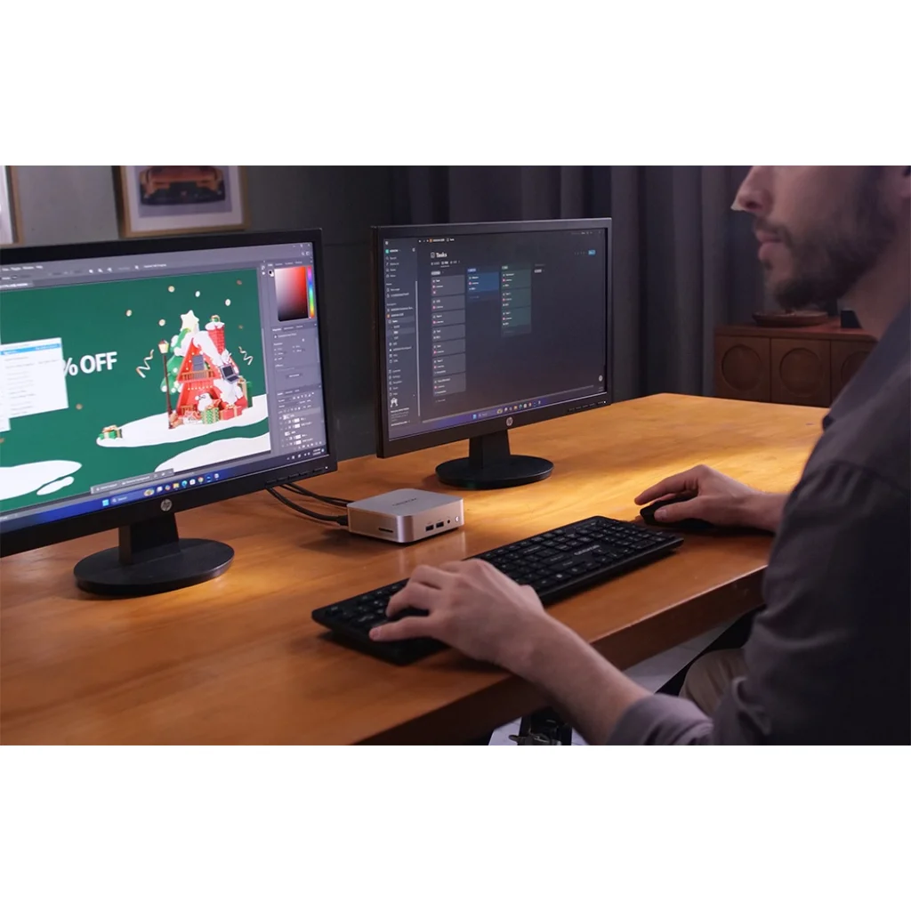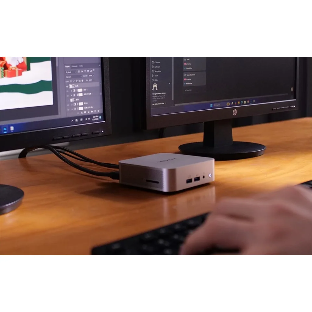 A mini PC kialakítása lehetővé teszi több eszköz egyidejű csatlakoztatását. A 2 HDMI 2.0 port és a 2 USB-C port akár 4 monitort is támogat 4K minőségben. Az USB 4.0 Gen 3 port nagy sebességű adatátvitelt és a csatlakoztatott eszközök tápellátását biztosítja. A további USB 3.2 és USB 2.0 portok lehetővé teszik a különböző kiegészítőkkel való munkát, az SD-kártyaolvasó pedig megkönnyíti a fájlok átvitelét fényképezőgépekről és videokamerákról.