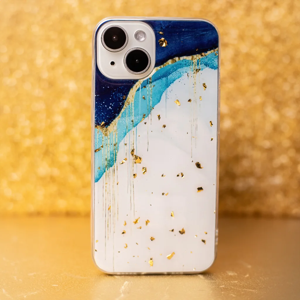 A tok hátulja eredeti mintával és arany pehely betétekkel van díszítve, különleges karaktert és eleganciát kölcsönözve a telefonnak. Ezzel szemben az oldalak átlátszók maradnak, így a dizájn sokoldalúbbá válik.