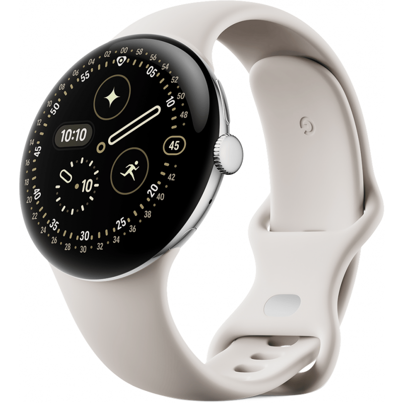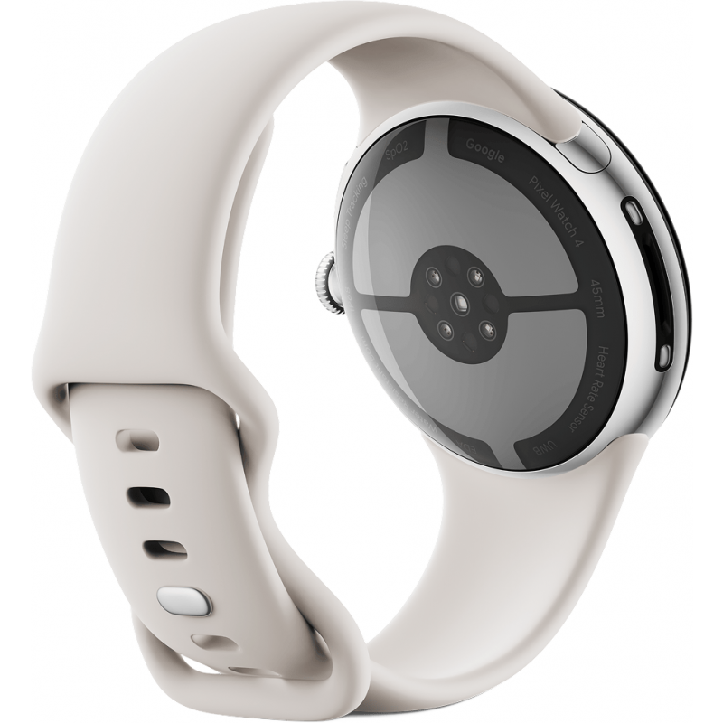 A Google Pixel Watch 4 letisztult és minimalista esztétikája azonnal magával ragad. A 45 mm-es, gondosan megmunkált, polírozott ezüst rozsdamentes acél tok, a lágyan ívelt, domború üveg és a porcelán színű, puha tapintású szilikon szíj együttesen biztosítják a prémium megjelenést és a kivételes viselési kényelmet. A diszkréten elhelyezett forgatható korona és oldalsó gomb intuitív vezérlést tesz lehetővé, míg a szabadalmaztatott szíjmechanizmus garantálja a zökkenőmentes illeszkedést és a könnyed cserélhetőséget.