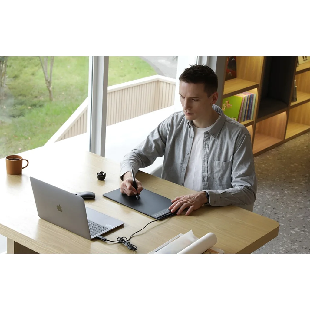 A HUION Inspiroy 2 S egy olyan grafikus tábla, amelyet a felhasználó kényelmét szem előtt tartva terveztek - legyen szó akár kezdő, akár haladó felhasználóról. Új, jobb tapintású gombokat kapott, amelyek a munkafelülettől való egyértelmű elkülönítésüknek (2 mm-rel magasabbak) és a speciális füleknek köszönhetően könnyebb kezelést tesznek lehetővé anélkül, hogy keresgélni kellene. Ezenkívül praktikus görgető csúszkával is fel van szerelve - ez az egér görgőjéhez hasonlóan működik, érzékenysége pedig a szoftverben állítható. Egyszerűen egy kényelmes és intuitív eszköz a munkához és a rajzoláshoz.