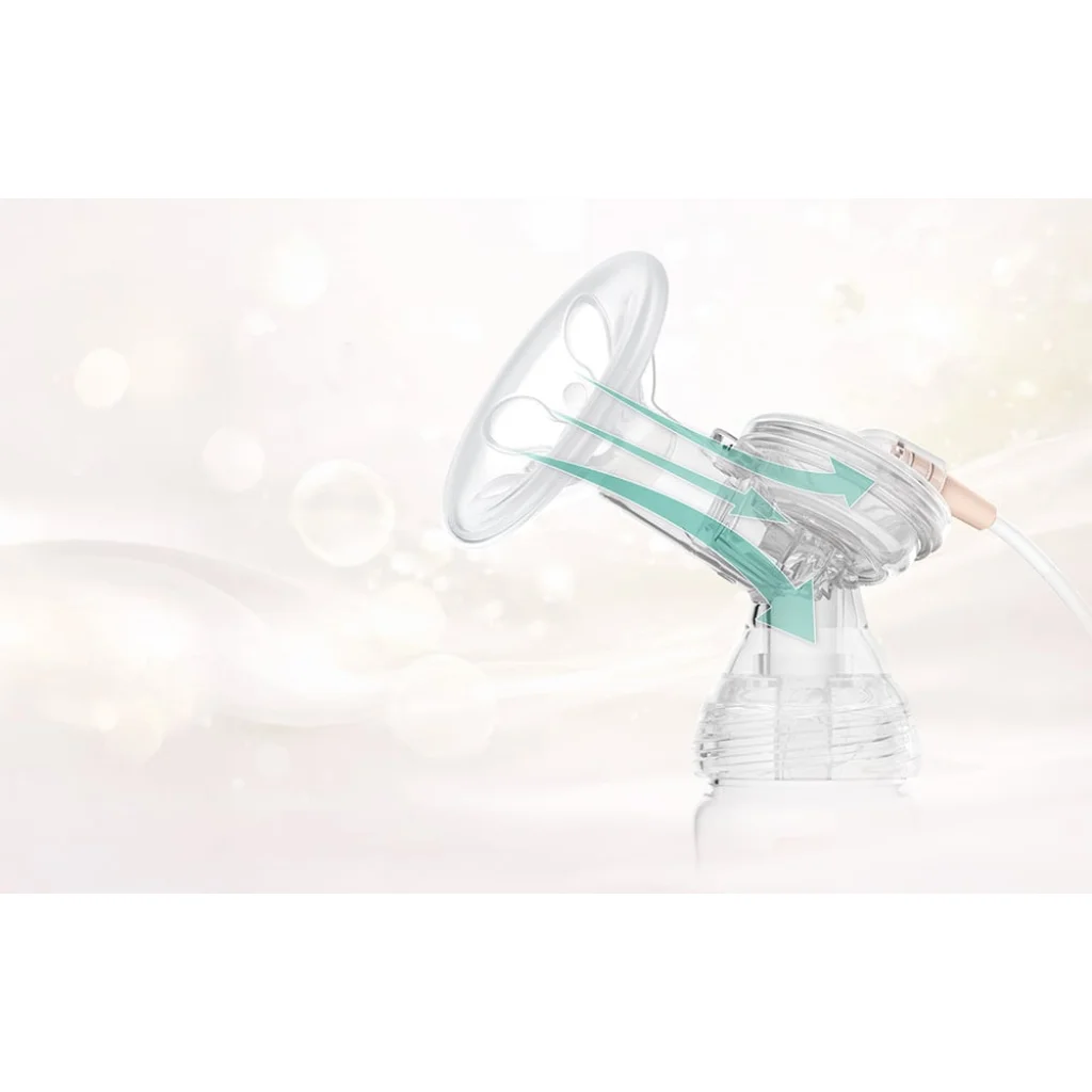 Higiénikus szivattyúzás és kíméletes a bőrrel: A szirmok profiljával ellátott szilikon masszázspárna egyenletesen illeszkedik a mellre, stabilizálva a készlet helyzetét működés közben. A tej visszafolyás-megelőző rendszer egyirányú gátként működik, biztosítva, hogy a tej csak a palackba kerüljön. Még akkor is, ha megváltoztatja a helyzetét, vagy véletlenül megdönti a szivattyút, a tej elválasztva marad a mechanikus alkatrészektől. Ez korlátozza a tejjel közvetlenül nem érintkező elemekkel való érintkezést.