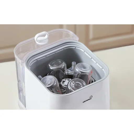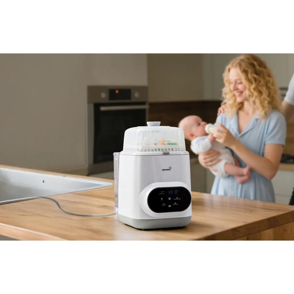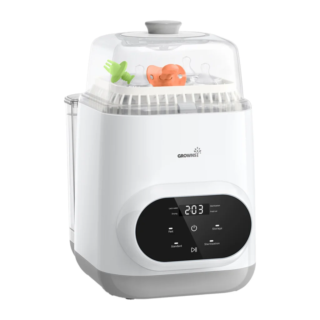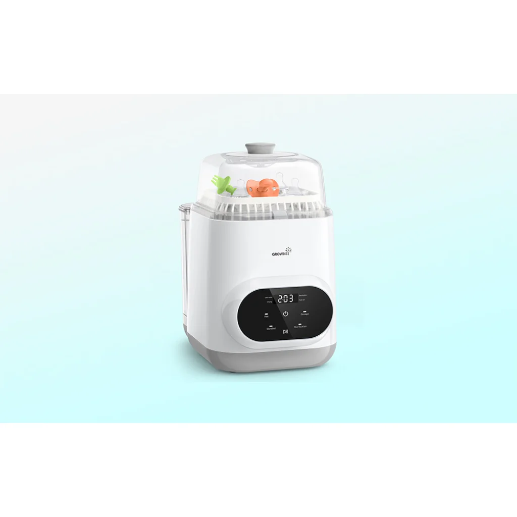A Grownsy multifunkcionális cumisüvegmosó átfogó megoldást kínál azoknak a szülőknek, akik tökéletes higiéniát szeretnének biztosítani babájuk kiegészítői számára napi súrolás és időpazarlás nélkül. A készülék egyesíti a mosást, a gőzsterilizálást és a forró levegős szárítást, miközben biztonságos tárolást is lehetővé tesz. Az intelligens ciklusvezérlésnek köszönhetően rugalmasan dönthet a sterilizálás vagy a szárítás folyamatáról anélkül, hogy újra kellene indítania a teljes programot.