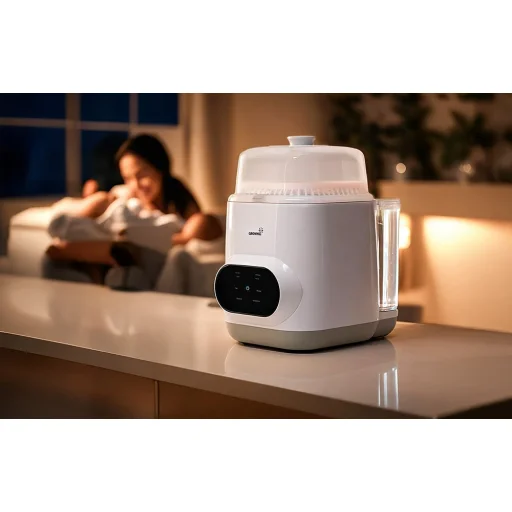 Az intelligens sterilizáló- és szárítófunkció magas hőmérsékletű gőzzel akár 99,99%-ban eltávolítja a baktériumokat, majd aktiválja a 3D meleg levegős szárítást. Az egyenletes, kíméletes légáramlás megőrzi a cumisüvegek alakját, és segít megelőzni a vízfoltok kialakulását. Ennek köszönhetően a kiegészítők nemcsak sterilek, hanem teljesen szárazak is lesznek, így azonnal használhatók vagy biztonságosan tárolhatók.