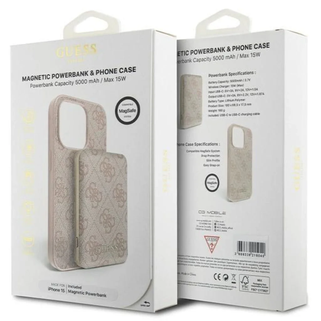 Ez a Guess által összeállított iPhone kiegészítő szett egy stílusos telefontokot és stylistaként illeszkedő power banket tartalmaz. Lenyűgöző megjelenésével hangsúlyozd modern és divatos stílusodat. Ez az elegáns kollekció elengedhetetlen kiegészítője azoknak, akik értékelik az eleganciát és az egyedi stílust, és szeretnék a Guess márka kifinomult esztétikájával gazdagítani okostelefonjukat.