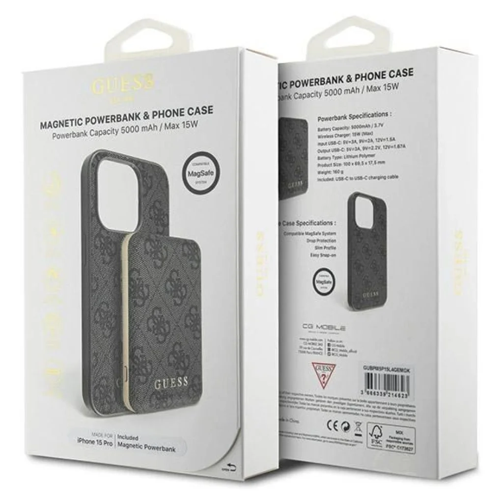 Bundle Pack Case+Powerbank Guess 4G Metal Gold Logo A set of iPhone accessories from Guess, which includes a stylish protective case for the phone and a stylistically matching power bank. Be captivated by its exclusive appearance and emphasize your passion for modernity and fashion. This elegant collection is an irreplaceable addition to the wardrobe for everyone who appreciates elegance, unique style and wants to add the refined aesthetics of the Guess brand to their smartphone. A case with a luxurious look This elegant collection will delight even the most demanding and refined tastes. The top layer of the covers is covered with delicate ecological leather, which is additionally decorated with a high-quality 4G print - giving it a refined character and style. This sophisticated collection is complemented by the beautiful golden Guess logo, which confirms the excellent quality and authenticity of the products for which this famous brand is responsible. Perfect protection for your phone An elegant case guarantees the safety of your smartphone. The case is very precisely fitted to the device, protecting it against scratches and impacts. Slightly raised outer edges protect the phone screen from damage, while raised outer edges around the camera lens protect the optics from breaking or scratching. A powerbank unlike any other If you are looking for a power bank that will not only quickly charge your device, but also become a beautiful decoration for your phone - you've come to the right place! With the Guess 4G Leather power bank, you can experience advanced technology and emphasize your refined sense of aesthetics. This is a perfect product for demanding customers who like luxury accessories. Great power hidden in a small package This extraordinary power bank offers a power of 5,000 mAh - it will certainly provide you with additional power for your phone whenever you need it. The battery capacity is fully sufficient to charge your smartphone's battery. Small dimensions and compact size make the device fit even into a small purse or pocket. Charge wirelessly! The Guess Powerbank allows you to charge mobile devices with Qi and MagSafe charging technology - thanks to perfectly matched magnets, the device adheres tightly to the phone and immediately starts transmitting energy. The maximum wireless charging power is 15W, which means that the device supports fast charging. Inductive charging is the perfect solution for anyone who values convenient and functional solutions - thanks to it, you will no longer need additional cables to charge your phone. Don't want to charge wirelessly? Nothing is lost! The phone can be charged via a USB-C cable - just plug it into the port on the power bank and the phone's battery will be powered. The set was produced under license from the Guess brand. Protective case Collection 4G Metal Gold Logo Type Hardcase Material TPU/PC/Eco-leather Color Black Compatibility iPhone 15 Pro 6.1" Induction power bank Capacity 5000mAh Power 5/7.5/10/15W (Max) USB-C input power 5V-3A, 9V-2A USB-C output power 5V-3A, 9V-2.22A, 12V-1.66A Color Black Compatibility iPhone series 12/13/14/15