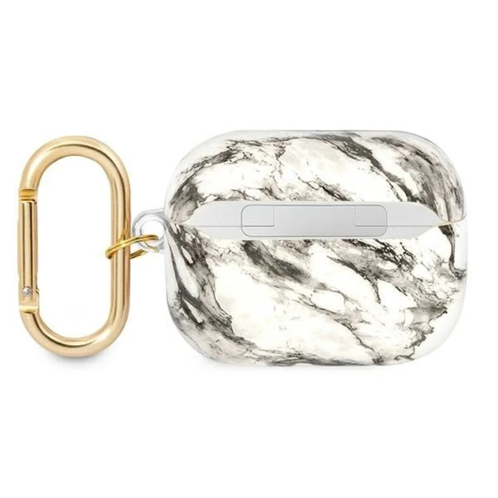 Divatos és stílusos AirPods tok a Márvány Szíj Kollekció sorozatból. Az exkluzív tok védi az Apple AirPods töltőállomást, és mindent biztosít, amire szükséged van a stílusos és divatos megjelenéshez. A Guess márvány tokok időtlen eleganciája minden esetben lenyűgöz eredeti designjával. Teljes védelem és biztonság az AirPods-odnak. Ütés-, esés- és karcolásálló kialakítás. A figyelemfelkeltő márvány minta, amelyet az arany Guess logó díszít a tok színéhez illő szíjon, kiemeli mindennapi, egyedi stílusodat. A kiváló minőségű tok tökéletesen illeszkedik az eredeti AirPods tokhoz. A tok oldalán található egy praktikus arany gyűrű, amely lehetővé teszi, hogy például pórázra rögzítsd a tokot.
