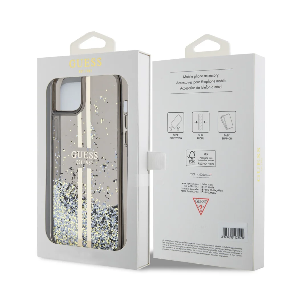 Guess PC/TPU Liquid Glitter Gold Stripe hátlap elegáns nyomtatással és Guess logóval a hátulján