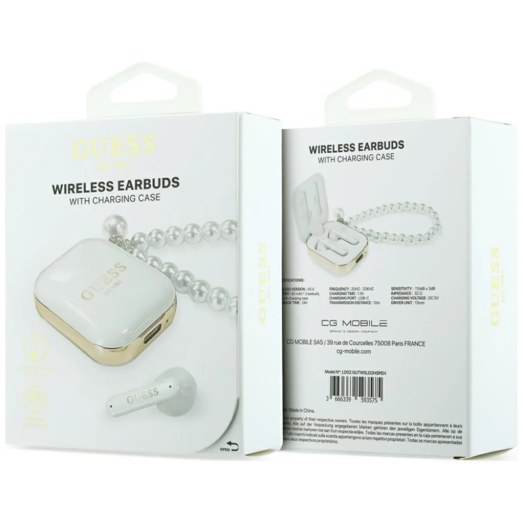 A Guess Pearl Strap TWS vezeték nélküli fülhallgató kiemelkedő hangminőség, elegáns megjelenés és funkcionalitás jellemzi, amely megfelel az elvárásainak. A fehér szín egyedi és minimalista megjelenést kölcsönöz a fülhallgatónak, míg az arany Guess logó a tokon luxus érzetet ad. A csillogó gyöngy díszítés kiemeli egyedi stílusát. A gyűjtemény tökéletesen ötvözi a funkcionalitást és az elegáns dizájnt, így a fülhallgatók nemcsak jól védettek, hanem divatos kiegészítővé is válnak.