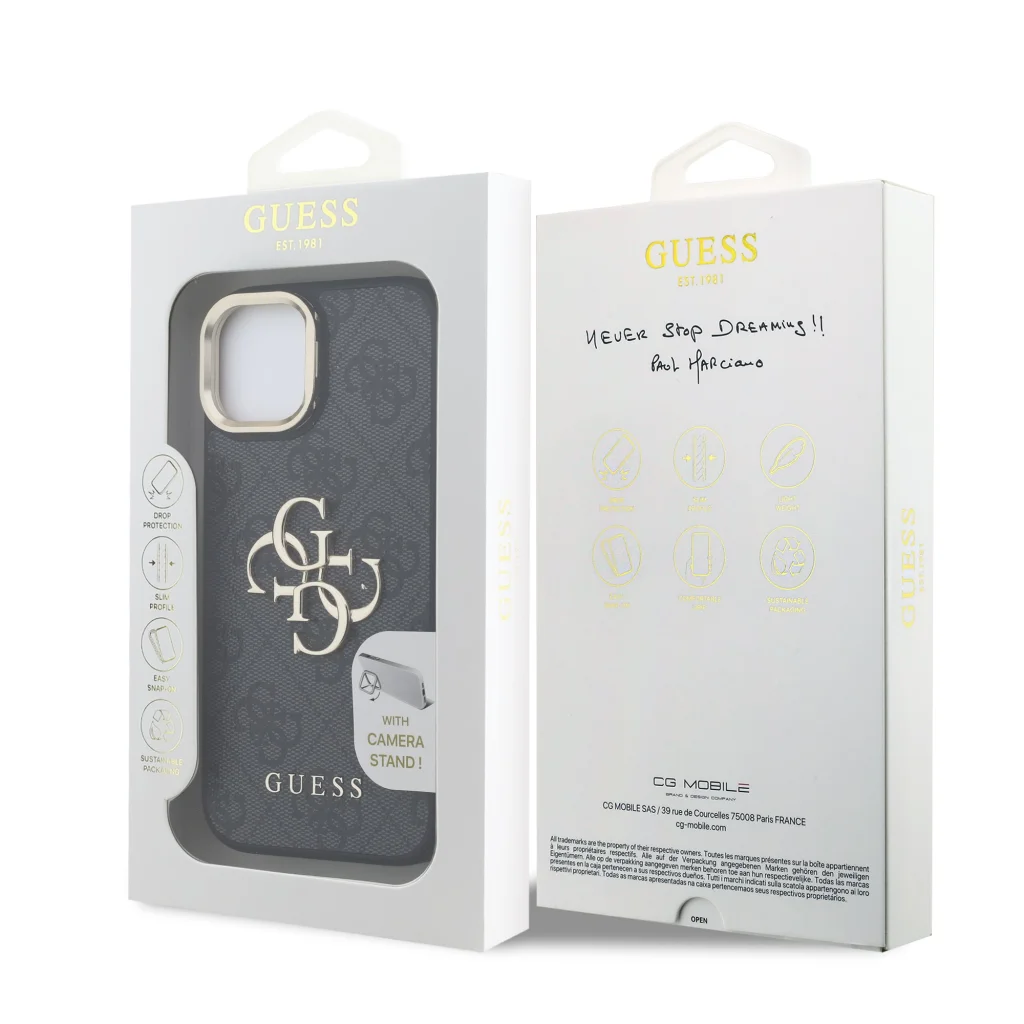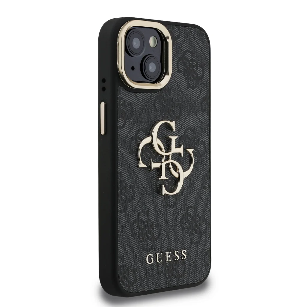 A prémium Guess PU 4G Fém Logós Állványos Kamera Keretes hátlap elegáns, jellegzetes 4G mintával rendelkezik, amit a GUESS logó egészít ki.