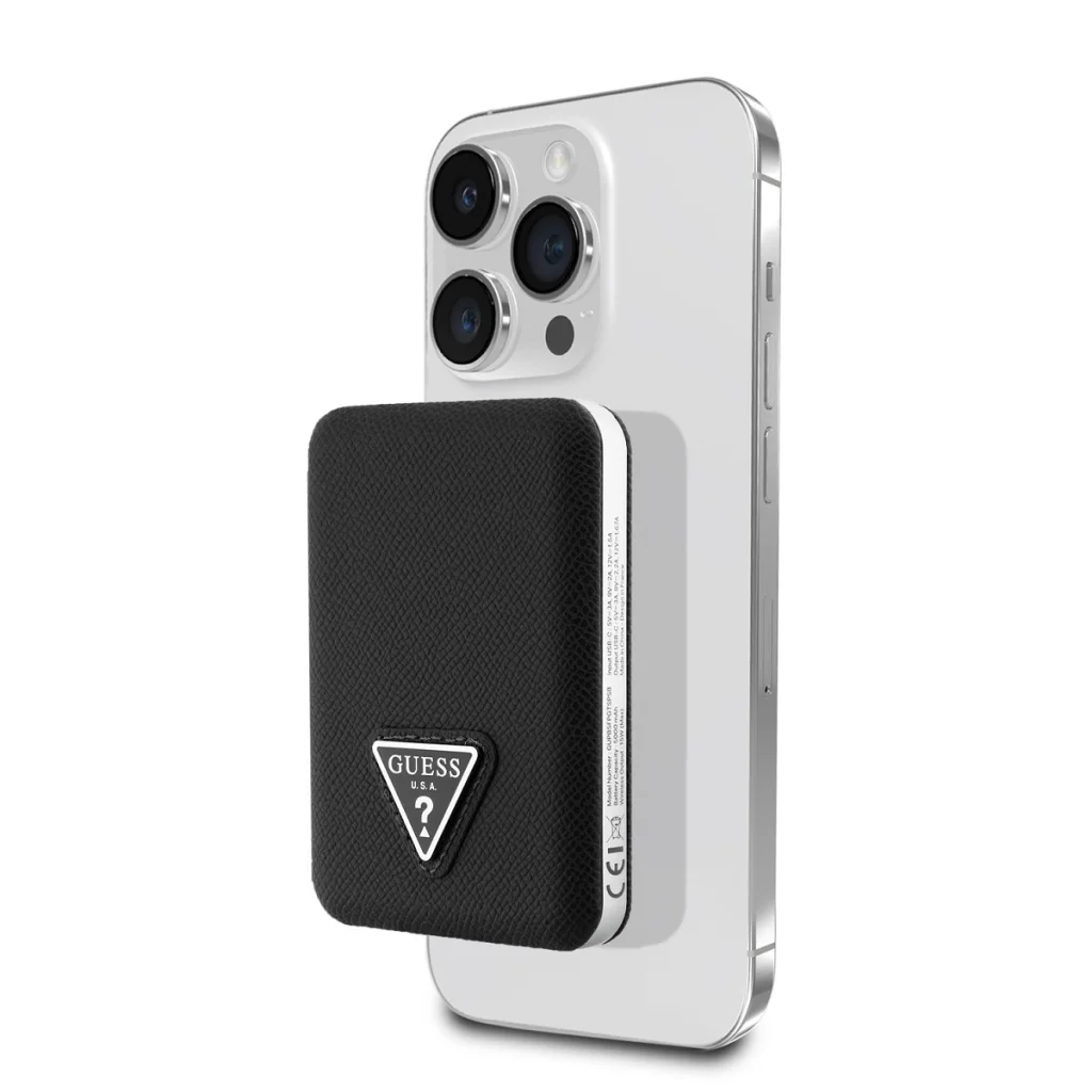 A Guess PU Grained Triangle Logo kompakt és stílusos powerbank a MagSafe funkcióval ideális kiegészítő az iPhone-odhoz, és nélkülözhetetlen társ az utazásaid során!