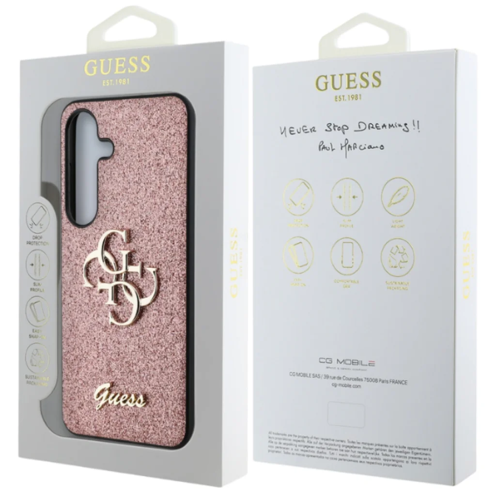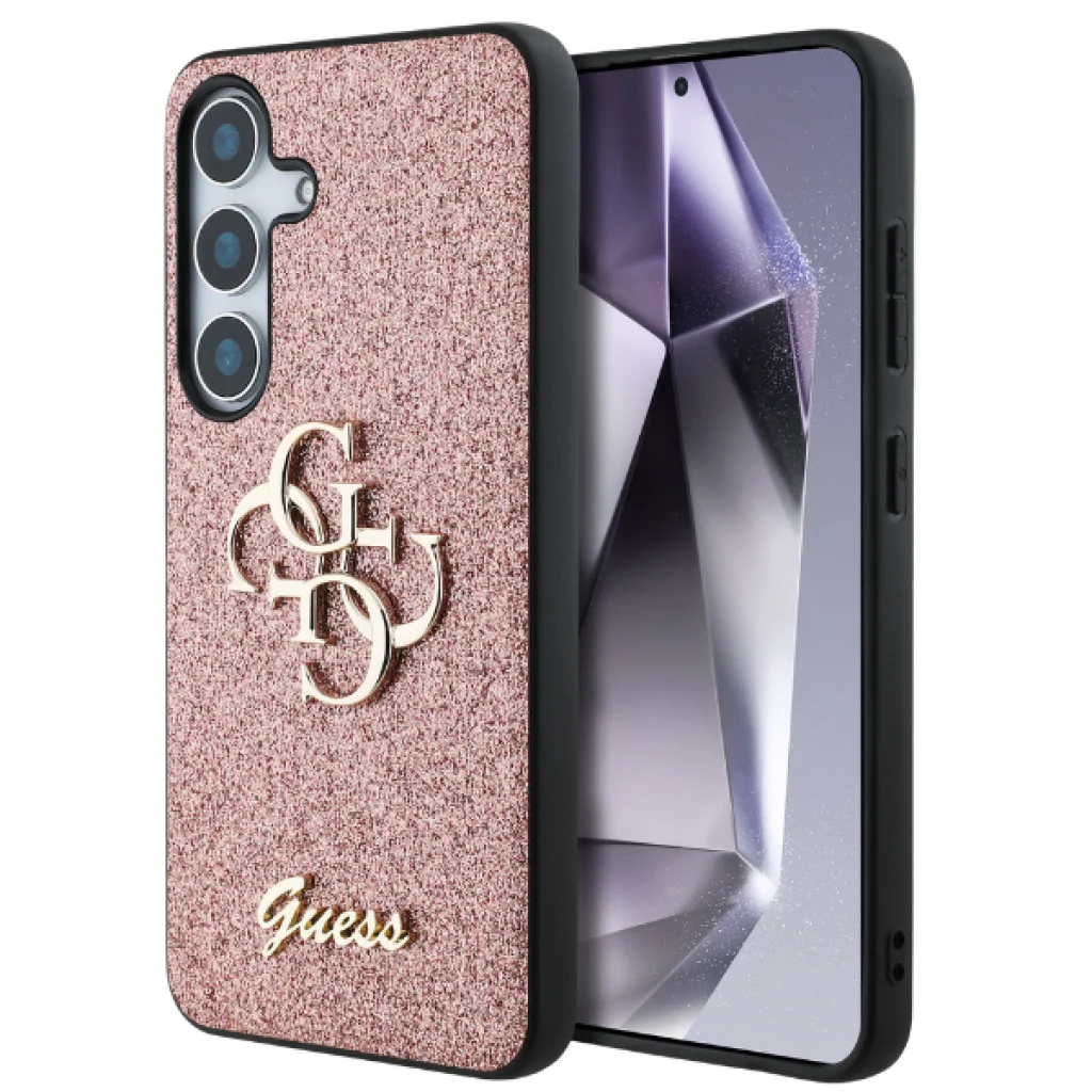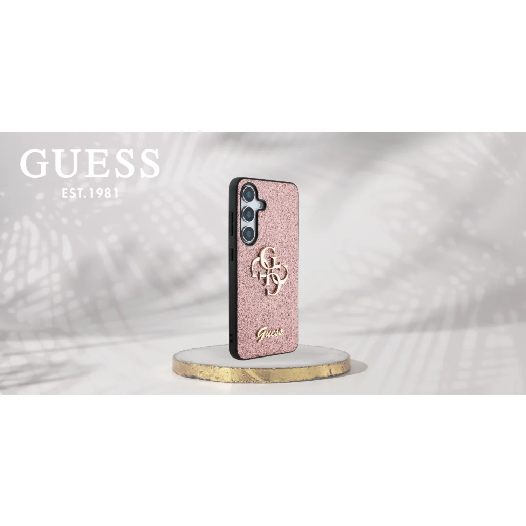 Guess csillámos tok a Rögzített Csillámos Nagy 4G Fém Logós kollekcióból, amelyet az elegáns, jól felismerhető 4G minta jellemez, arany GUESS logóval szignálva.