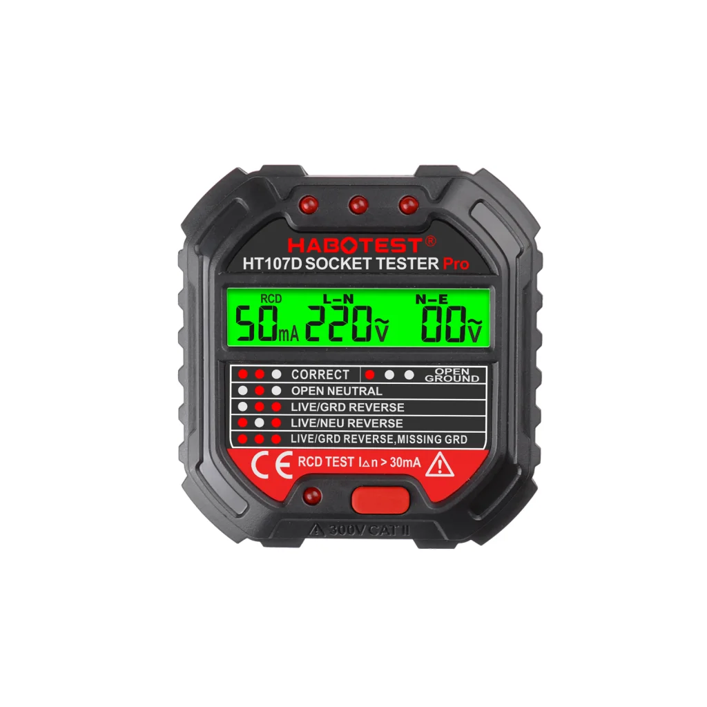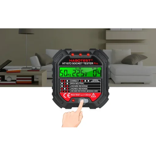 A vizsgáló egy fényes digitális kijelzővel van felszerelve, amellyel könnyen olvashatók a mérési eredmények. A készülék tetején található LED-jelző bármilyen probléma esetén tájékoztatást nyújt. Ha a vizsgáló bármilyen rendellenességet észlel, a LED-ek egy adott kombinációban világítanak. Így gyorsan megtudhatja például a helyes bekötést, földelés hiányát, élő vezetéket stb. Az HT107D-vel egyszerű RCD tesztet is végezhet, csak nyomja meg a megfelelő gombot.