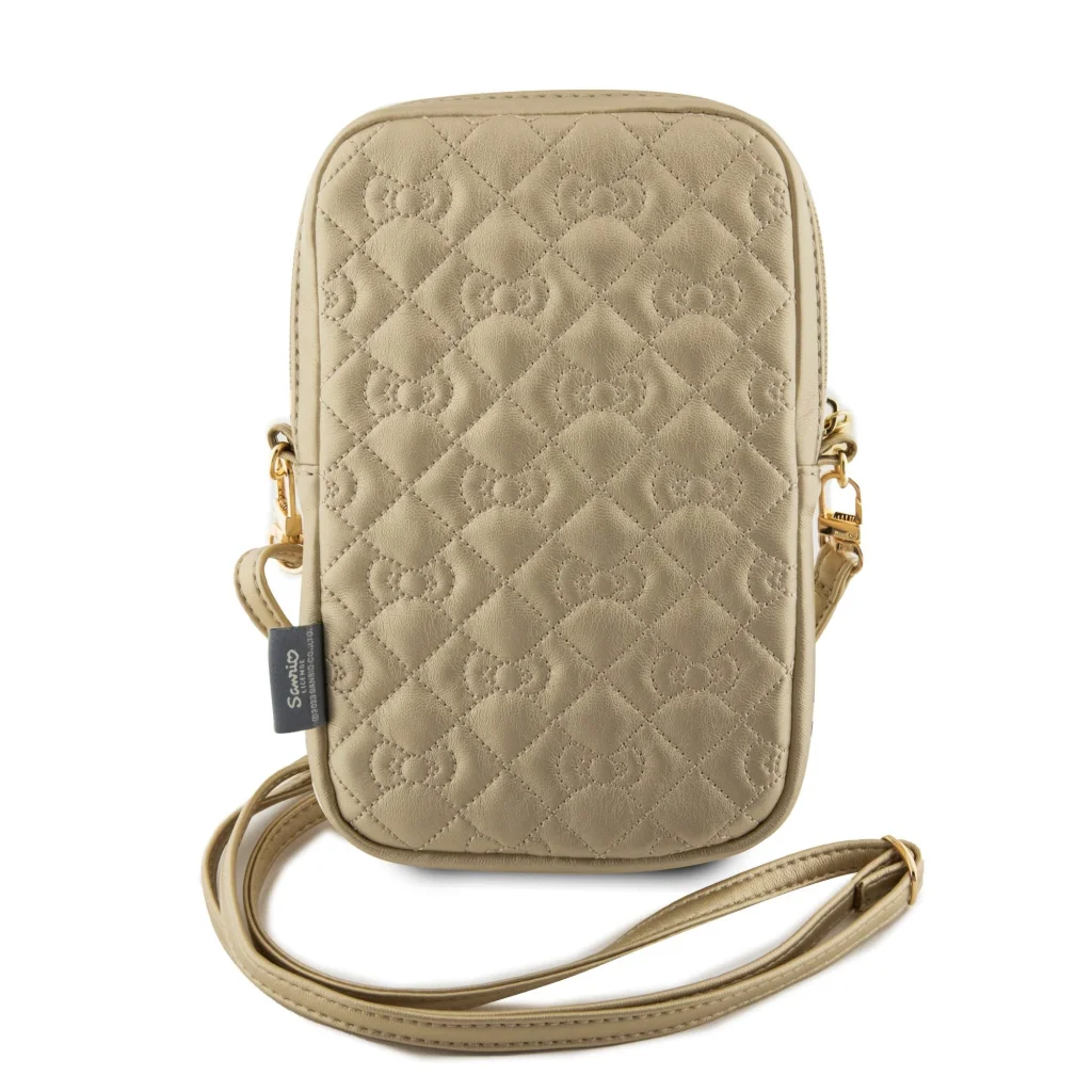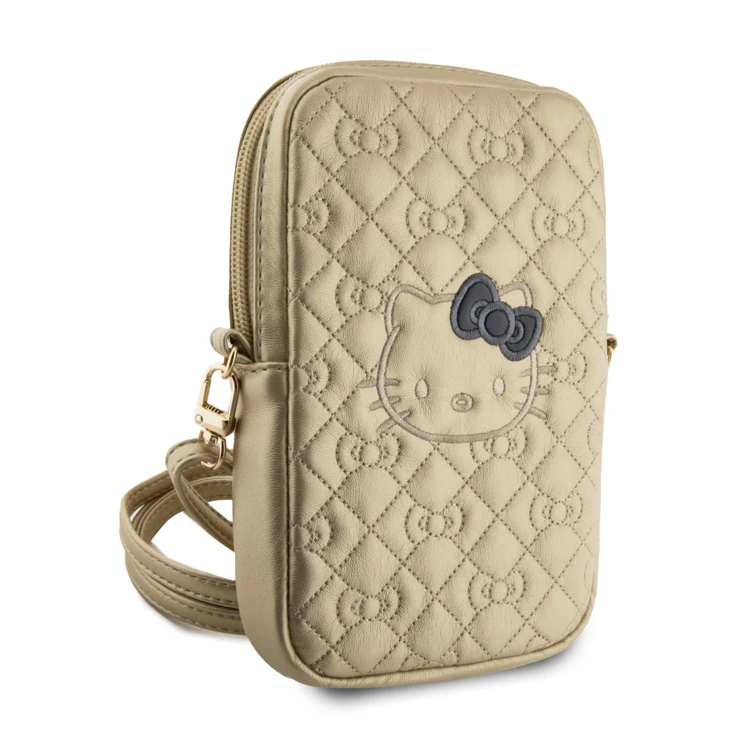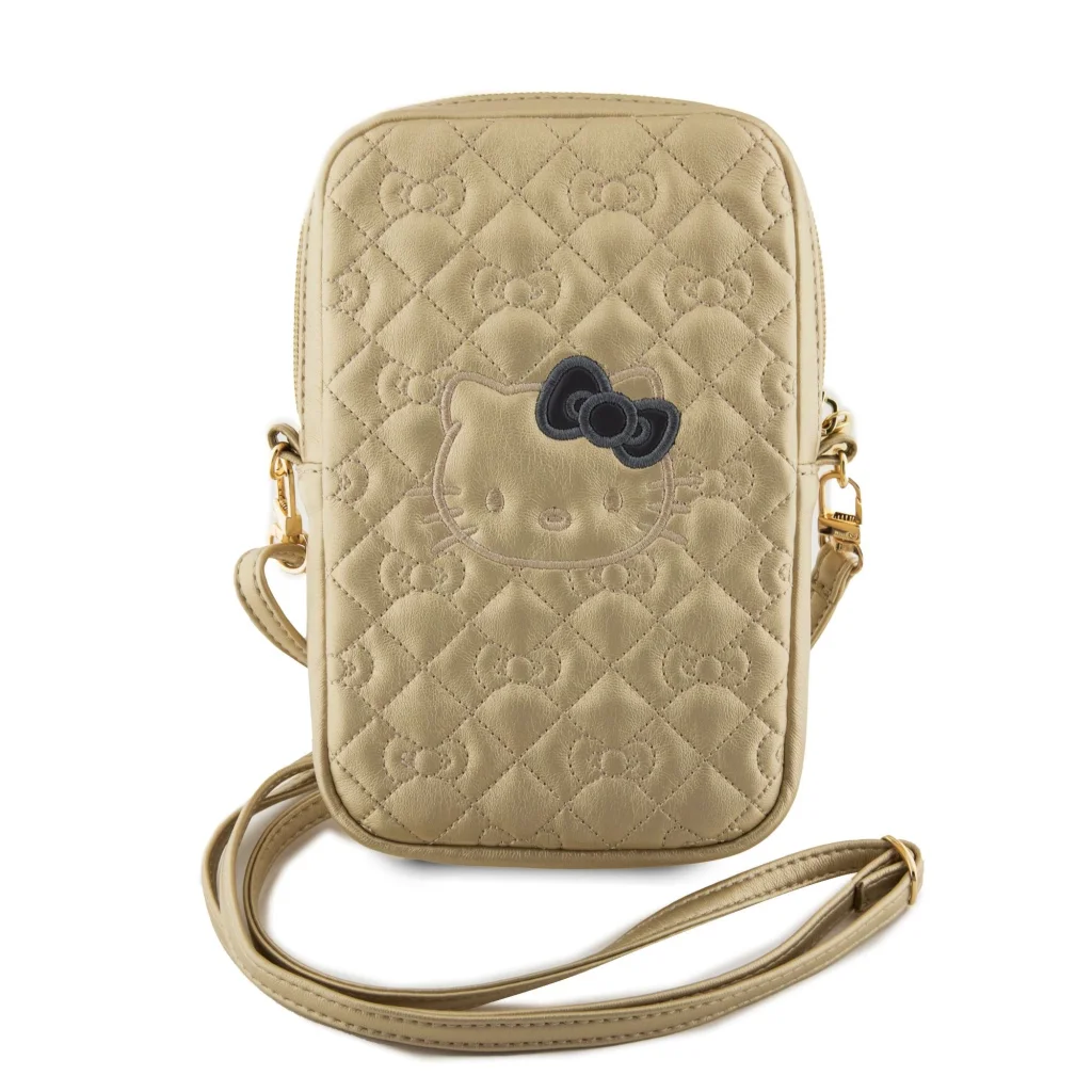 Bemutatjuk a Hello Kitty telefontáskát és pénztárcát, amely sima PU bőrből készült, Hello Kitty logóval nyomtatva és nylon keresztpántos hevederrel.