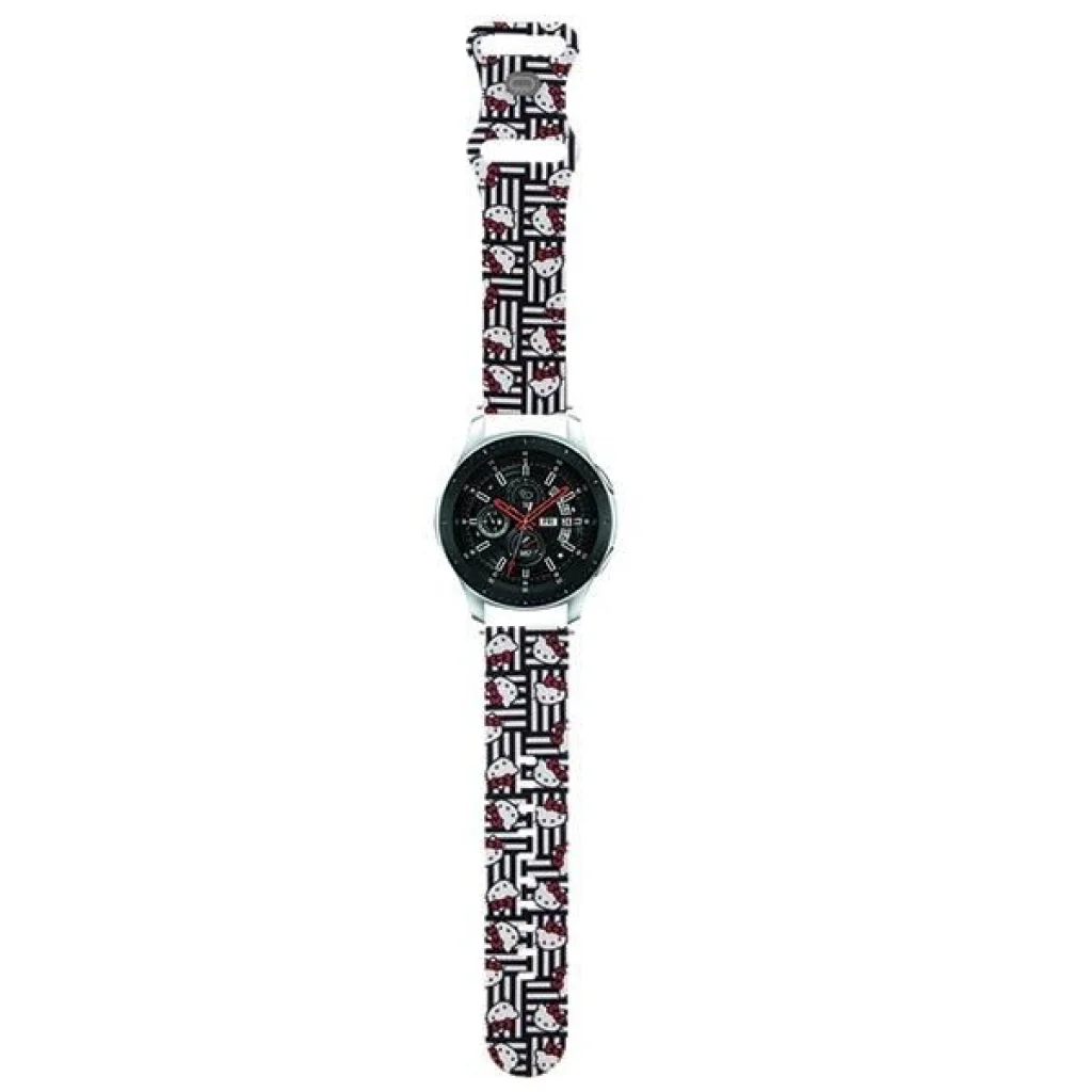 Hello Kitty Silicone Heads & Stripes - Egy bájos okosóra szíj, a Hello Kitty márka alatt. Egy nagyon kényelmes, univerzális szíj, melynek szélessége 22 mm. A szíj a személyre szabott csuklókörmérethez állítható, patentekkel és hurokkal rögzíthető. A szíj a legmagasabb minőségű, puha és nagyon tartós szilikonból készült. A szilikon használata rendkívül ellenállóvá teszi a szíjat a sérülésekkel és elszíneződésekkel szemben, valamint nem okoz kényelmetlenséget az emberi bőr számára a mindennapi használat során. Ez az egyedülálló szíj imádnivaló grafikákkal van díszítve, amelyek tökéletesen bemutatják Hello Kitty egyediségét és báját. Az aranyos cica fejek a számos fekete-fehér csík háttér előtt egy különleges kompozíciót alkotnak, amely vonzza a figyelmet és különlegessé teszi az Apple Watch órát. A termék a Hello Kitty márka licencével készült.