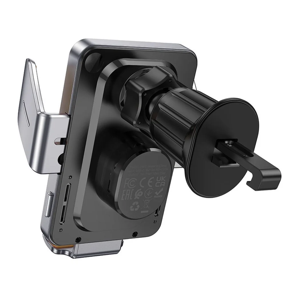 Hoco autós telefontartó vezeték nélküli töltéssel. A légkondicionáló rácsára rögzíthető. Lehetővé teszi, hogy biztonságosan használja okostelefonját vezetés közben. Magas minőségű alkotóelemekből készül, garantálja a sérülésekkel szembeni ellenállást és a hosszú távú használatot. Akár 15 W teljesítményű vezeték nélküli töltést tesz lehetővé. Kompakt, könnyű kialakítása megkönnyíti a termék szállítását és tárolását. Specifikáció: