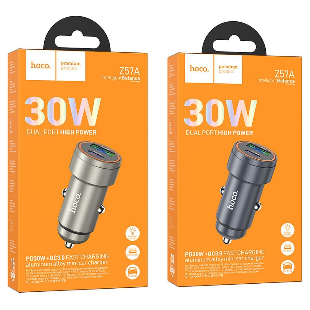 A Hoco Z57A autós töltő gyors töltési funkcióval és kettős kimenettel rendelkezik: USB-C, USB-A. Lehetővé teszi a mobil eszközök gyors töltését az autóban. A töltő dual USB-C (30 W) és USB-A (18 W) kimenettel van felszerelve, lehetővé téve két eszköz egyidejű töltését. A termék támogatja a PD, QC3.0, FCP, AFC gyors töltési megoldásokat és más gyors töltési megoldásokat is. Alumínium ötvözetből készült, a töltő rendkívül tartós és ellenálló a sérülésekkel szemben. Az intelligens felismerés lehetővé teszi az eszközhöz illeszkedő áramerősség kiválasztását, biztosítva a biztonságos használatot. Specifikáció: