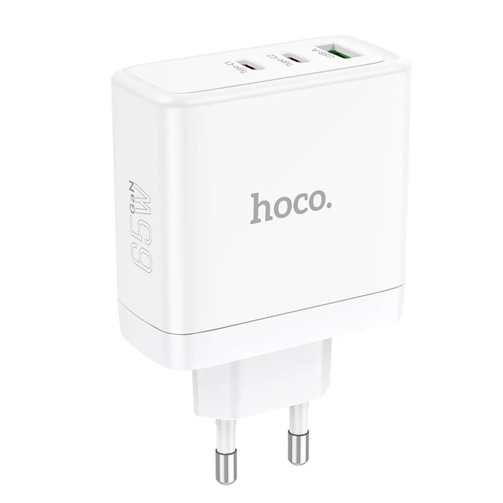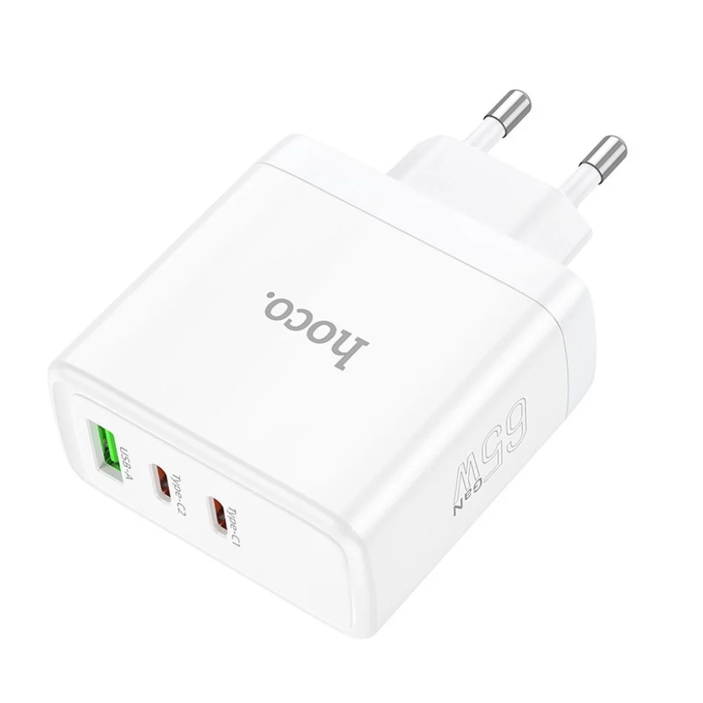 Hoco fali töltő gyorstöltési funkcióval és három porttal: 2 USB-C és USB-A. Lehetővé teszi a mobil eszközök gyors töltését. GaN technológiával készült.