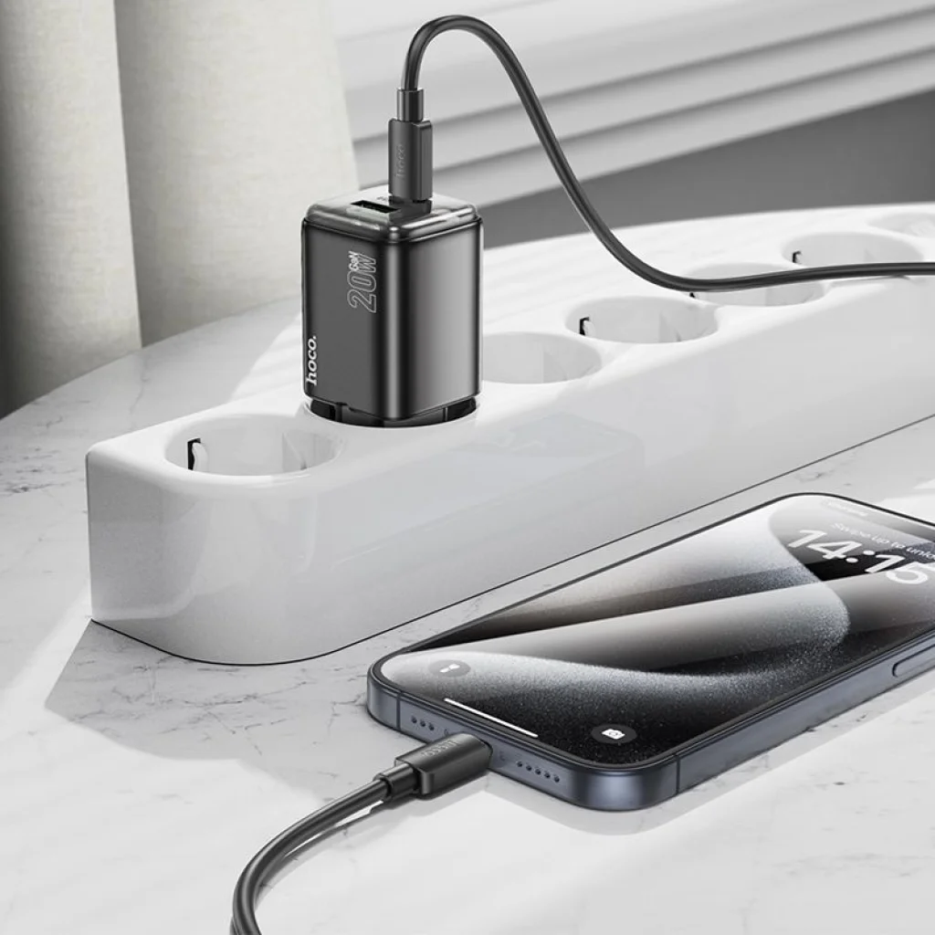 A Hoco N52 fali töltő gyors töltési funkcióval és kettős kimenettel rendelkezik. Lehetővé teszi a mobil eszközök gyors töltését. A csomag tartalmaz egy 1 méteres USB-C - Lightning kábelt. A töltő kettős kimenettel van felszerelve: USB-C (20 W) és USB-A (18 W), amelyek lehetővé teszik 2 eszköz egyidejű töltését. A termék támogatja a gyors töltési technológiákat: PD, QC 3.0, FCP, AFC és egyéb megoldásokat. PC-ből készült, a töltő rendkívül tartós és ellenálló a sérülésekkel szemben. Az intelligens felismerési funkció lehetővé teszi az aktuális áram beállítását a megfelelő eszközhöz, biztosítva a biztonságos használatot. A töltőhöz tartozik egy 1 méteres USB-C - Lightning kábel. Specifikáció: Portok: USB-C, USB-A Teljes kimeneti teljesítmény: 5 V / 3 A Teljesítmény: - USB-C 20 W (PD, QC 3.0, FCP, AFC) - USB-A 18 W (QC 3.0, FCP, AFC) Anyag: PC (tűzálló) Kábel: USB-C - Lightning 1 m Csatlakozó: EU Méret: 83 x 39.5 x 26.5 mm Súly: 70 g Gyorstöltési technológia támogatás: PD, QC 3.0, FCP, AFC