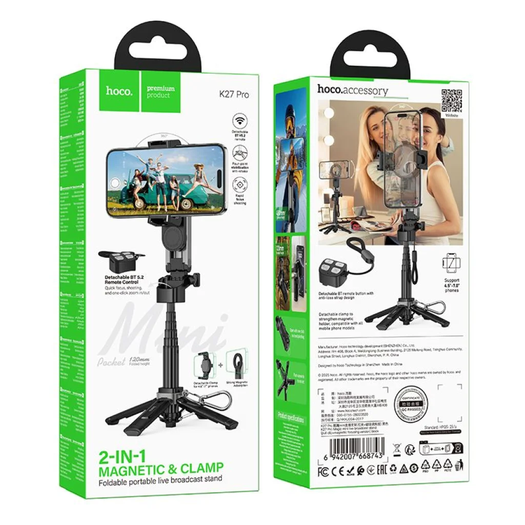 A Hoco K27 PRO élőállvány egy funkcionális tripod mágneses és univerzális tartóval, videó felvételekhez, élő közvetítésekhez és fényképezéshez tervezve. A készlet tartalmaz egy vezeték nélküli Bluetooth távirányítót a kényelmes távoli vezérléshez. A Hoco K27 PRO modell mind otthoni, mind kültéri használatra alkalmas. A kialakítás lehetővé teszi, hogy gyorsan felállíts egy állványt élő közvetítésekhez, fényképezéshez, videózáshoz vagy szelfikhez, anélkül, hogy a telefonodat kézben kellene tartanod. A tripod tartós ABS műanyag és alumínium ötvözet kombinációjából készült, ami biztosítja a stabilitást és tartósságot, miközben alacsony súlyt tart fenn. Kinyitva akár 480 mm-es magasságot is elér, ami lehetővé teszi a képek kényelmes keretezését. Az univerzális tartó kompatibilis a 4,5-től 7,0 hüvelykes átlójú telefonokkal, és a tartomány állítása 55-től 90 mm-ig terjed. A mágneses tartó tovább növeli a készülék rögzítésének kényelmét és sebességét. A mellékelt vezeték nélküli távirányító Bluetooth 5.2-n keresztül csatlakozik, és lehetővé teszi a felvételek távoli vezérlését vagy a fényképezést. A kompakt vezérlő egyetlen töltéssel akár 8 óra működést biztosít. Specifikációk: Terméktípus: telefon tripod/állvány távirányítóval Anyag: ABS, alumínium ötvözet Méretek: 120 × 66 × 67 mm Kinyitott magasság: legfeljebb 480 mm Súly: 201 g Telefontípus kompatibilitás: 4,5 & 7,0 hüvelyk Tartomány állítás: 55 & 90 mm Távirányító: Bluetooth 5.2 Távirányító akkumulátor kapacitása: 55 mAh Távirányító töltési ideje: kb. 3 óra Távirányító működési ideje: legfeljebb 8 óra Alkalmazás: élő közvetítések, videó felvétel, fényképezés, szelfi