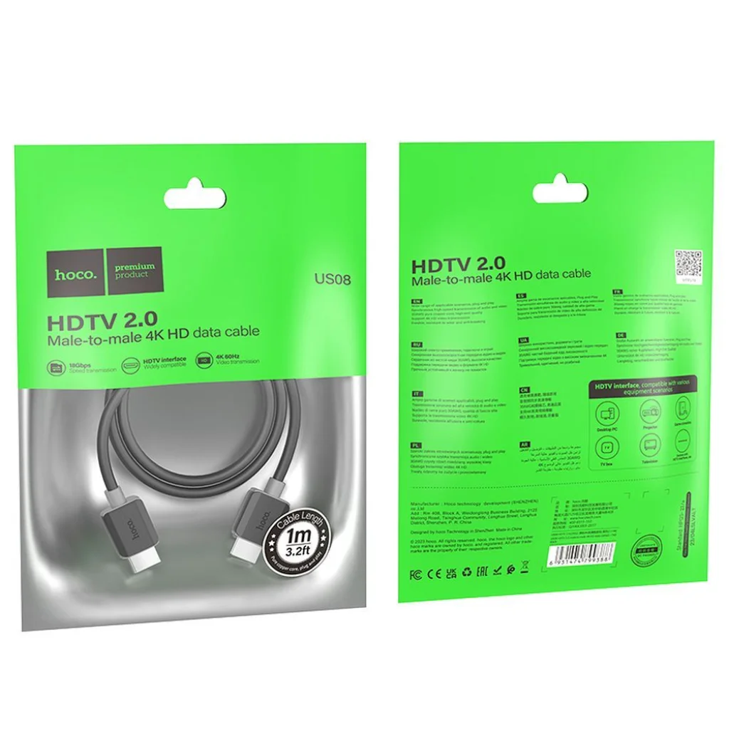 A HOCO US08 kiváló minőségű HDMI - HDMI kábel, amely megfelel a 2.0 verziónak, és lehetővé teszi a képek átvitelét 4K felbontásban 60Hz-en. Az előrehaladott technológiának és a 18 Gbps sávszélességnek köszönhetően biztosítja a zavartalan, folyamatos jelátvitelt, így ideális választás TV-k, monitorok, játékkonzolok, laptopok és más eszközök csatlakoztatásához. A kábel tartós PVC-ből készült, amely biztosítja annak rugalmasságát és ellenállását a károsodással szemben. A tiszta rézmag (30AWG) garantálja a stabil kapcsolatot és a kiváló minőségű adatátvitelt jelveszteség nélkül. Az 1 méteres hosszúság kényelmes használatot tesz lehetővé, biztosítva a rugalmasságot az eszközök elhelyezésében. A HOCO US08 támogatja a valós idejű audio- és videószinkronizálást, így kiváló választás filmnézéshez, konzoljátékokhoz vagy nagy képernyős munkákhoz. A 4K 60Hz támogatás tiszta, részletgazdag képet biztosít magas kontraszttal és élénk színekkel. Specifikáció: