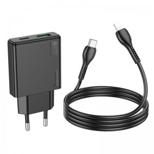 HOCO slim fali töltő USB A + USB-C csatlakozóval, valamint USB-C - Lightning kábellel PD QC3.0 3A 20W N38 fekete