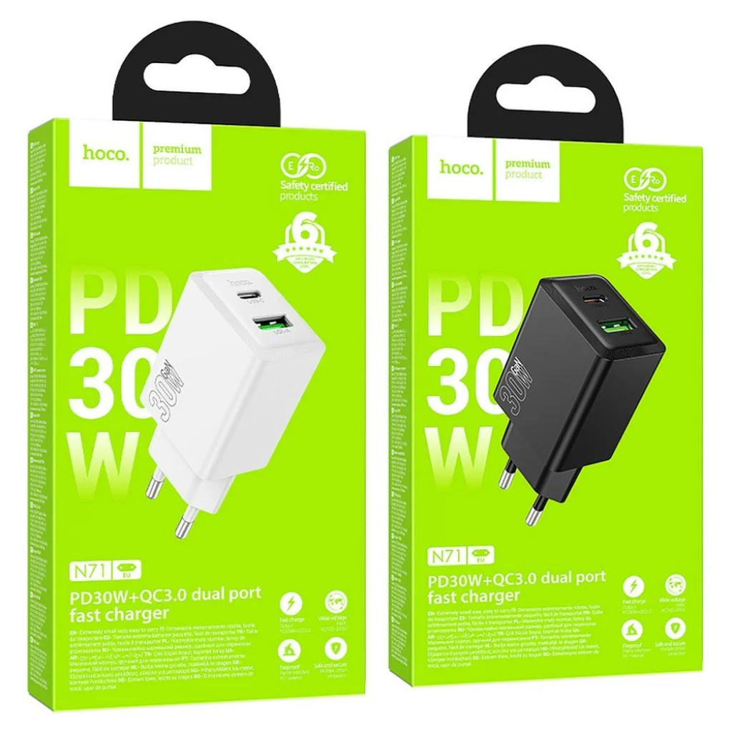 A Hoco N71 hálózati töltő gyors töltési funkcióval és kettős kimenettel rendelkezik. Lehetőséget biztosít mobil eszközök gyors töltésére. A töltő kettős kimenettel van felszerelve: USB-C (30 W) és USB-A (18 W), ami lehetővé teszi, hogy egyszerre 2 eszközt töltsön. A termék támogatja a gyors töltési megoldásokat, mint a PD, QC 3.0, FCP, AFC és mások. PC anyagból készült, a töltő rendkívül tartós és ellenálló a sérülésekkel szemben. Az intelligens felismerő rendszer lehetővé teszi, hogy az áramot az adott eszközhöz igazítsa, biztosítva a biztonságos használatot. Specifikáció: Portok: USB-C, USB-A Teljes kimeneti teljesítmény: 5 V / 3 A Teljesítmény: - USB-C 30 W (PD, QC 3.0, FCP, AFC) - USB-A 18 W (QC 3.0, FCP, AFC) Anyag: PC (tűzálló) Kábel: nincs Dugó: EU Méret: 83 x 39.5 x 26.5 mm Súly: 70 g Technológia támogatja a gyors töltést: PD, QC 3.0, FCP, AFC