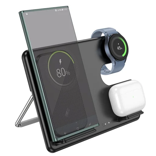 3 az 1-ben vezeték nélküli töltő. Lehetővé teszi okostelefonok, Samsung Galaxy Watch és TWS fejhallgatók induktív töltését. 15W teljesítményigényű eszközökre tervezve. Tölts több eszközt egyetlen kiegészítővel! A Hoco töltő egyidejűleg háromféle eszköz induktív töltését teszi lehetővé: okostelefonok, TWS fejhallgatók, Samsung Galaxy Watch-ok. Ez rengeteg helyet takarít meg, mivel csak egy kiegészítőt kell használnod ezen eszközök töltéséhez. A termék ABS, PC és alumínium ötvözetből készült, ellenáll a sérüléseknek és kényelmes kezelést biztosít. Specifikáció: