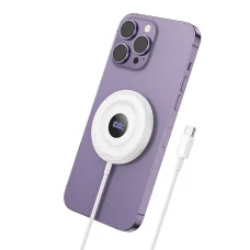 1. Bemenet Type-C: 5V/2A, 9V/2A 2. Vezeték nélküli kimenet: 5W/7.5W/10W/15W (MagSafe vezeték nélküli kimenet: 7.5W) 3. Szükséges saját PD töltő 4. Anyag: ABS+PC lángálló burkolat 5. Méret: 577.5mm (átmérő vastagság); Súly: 40g; Kábel hossza: 1m 6. LED digitális kijelzővel, amely lehetővé teszi a töltési teljesítmény valós idejű ellenőrzését.