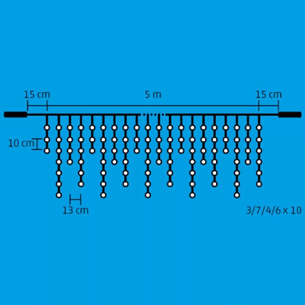 Ez a 5 méteres fényfüggöny 200 hidegfehér LED-del rendelkezik, amelyek gyönyörű, tiszta fényt biztosítanak, ezzel varázsolva egyedi hangulatot bármely környezetbe. Az állófényű LED-ek egyenletesen oszlanak el a 3/7/4/6 füzérekből álló, 10 csoportos rendszerben, amely látványos, mégis harmonikus megjelenést eredményez. A fehér vezeték kiválóan illeszkedik a különféle környezetekbe, legyen szó beltéri karácsonyi díszítésről vagy kültéri fénydekorációról.
