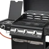 A grill három darab főégővel van felszerelve, melyek egyenként 3,2 kW teljesítményt biztosítanak. A középső égő piezo gyújtással egyszerűen beindítható, megbízható működést garantálva minden alkalommal. A további kényelmet és sokoldalúságot növeli a 3,2 kW teljesítményű oldalsó gázégő, amely szintén piezo gyújtású – ideális kiegészítő szószok, köretek vagy előételek elkészítéséhez a főételek mellett.