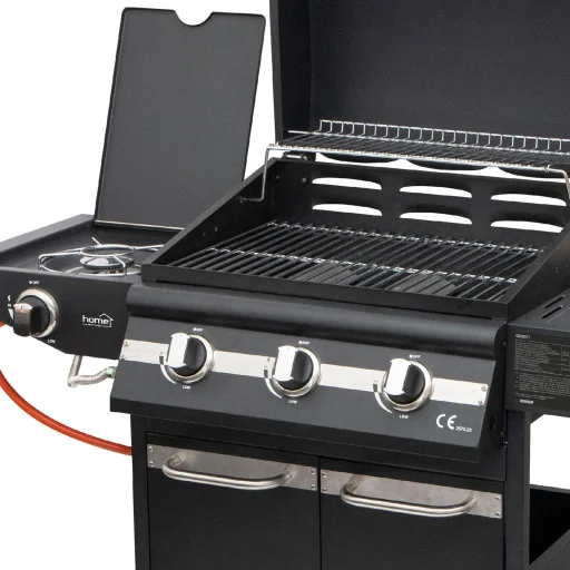 A Home GRG01 gázgrill ideális választás mindazoknak, akik megbízható, nagy teljesítményű és könnyen kezelhető kültéri grillezőt keresnek. A készülék három külön vezérelhető főégővel és egy praktikus oldalégővel rendelkezik, így egyszerre több fogás is elkészíthető – legyen szó húsokról, zöldségekről vagy akár szószokról. A letisztult design, a porszórt acél készülékház és a beépített hőmérő a stílusos és hatékony kerti sütés minden elvárásának megfelel.