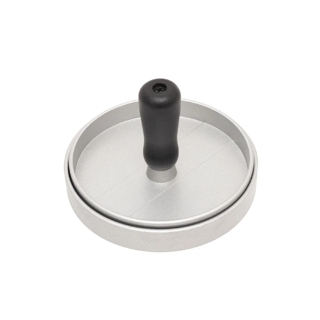 A hamburgerprés bordázott alumínium felülettel készült, amely nemcsak a klasszikus grillmintát nyomja bele a húsba, de egyenletes hőeloszlást is biztosít a sütés során. Ezáltal a pogácsák kívül ropogósak, belül szaftosak maradnak – pont úgy, ahogy a tökéletes hamburgerhez illik. A műanyag fogantyú ergonomikus kialakítása kényelmes fogást nyújt, miközben biztosítja a megfelelő nyomóerőt a húsmasszára.