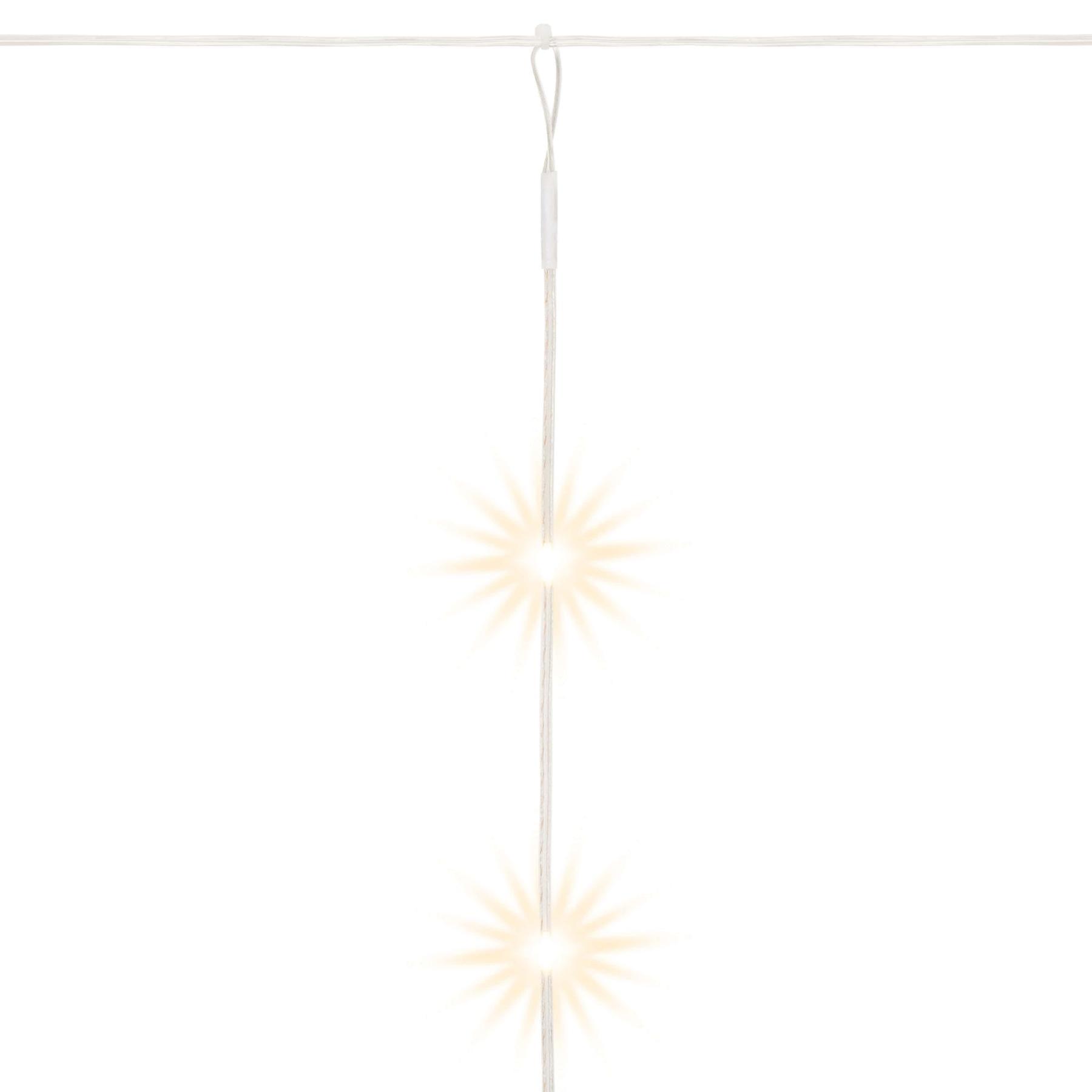 Ez a fényfüggöny állófényű, vagyis nem villog, nem vált fénytípust, hanem egyenletes, nyugtató melegfehér fénnyel világít. A 10 különböző hosszúságú LED-füzér (5/4/5/6/5/4/5/6/4/6) finom ritmust alkot, mely még dinamikusabbá teszi az összhatást. Az áttetsző vezeték szinte láthatatlan marad a sötétben, így a figyelem kizárólag a fénypontokra irányul.