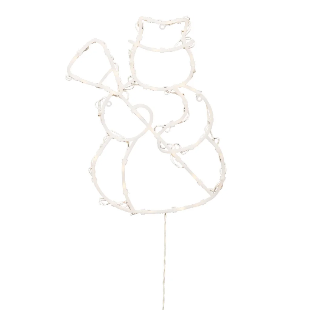 A dísz központi eleme egy mosolygós hóember forma, amelyet 35 darab melegfehér LED világít meg, kellemes és barátságos fényhangulatot teremtve. A fehér vezeték diszkréten simul a környezetébe, így a fények játsszák a főszerepet – nem a kábelek. A dísz kültéri és beltéri használatra egyaránt alkalmas, így nemcsak az otthon belső tereiben, hanem ablakra vagy teraszajtóra is tökéletesen elhelyezhető.