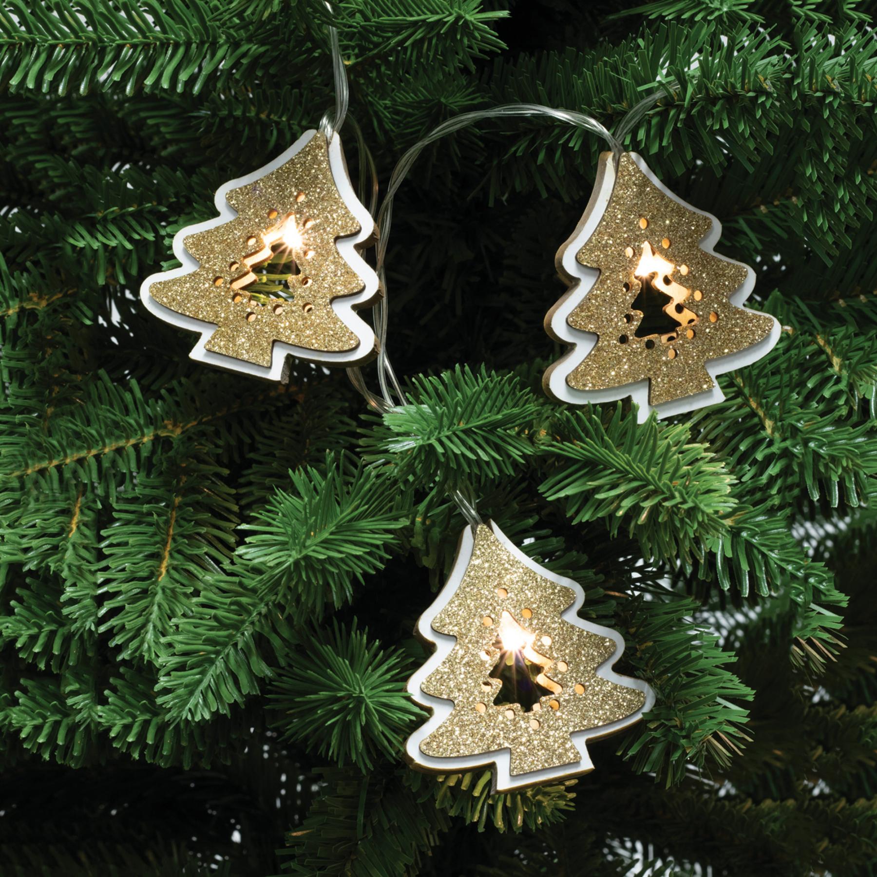 Ez a prémium beltéri dekoráció 20 db melegfehér LED-et tartalmaz, amelyek mindegyike egy-egy arany glitterrel díszített, fából készült fenyőfigura közepén helyezkedik el. A 5,5 x 6 cm-es fenyők elegáns csillogással ruházzák fel a füzért, ezzel ünnepi ragyogást biztosítva az Ön otthonának. A melegfehér LED-ek lágy, kellemes fényt árasztanak, amelyek nemcsak energiatakarékosak, de kellemes, pihentető fényhatást is biztosítanak a hosszú téli estéken.