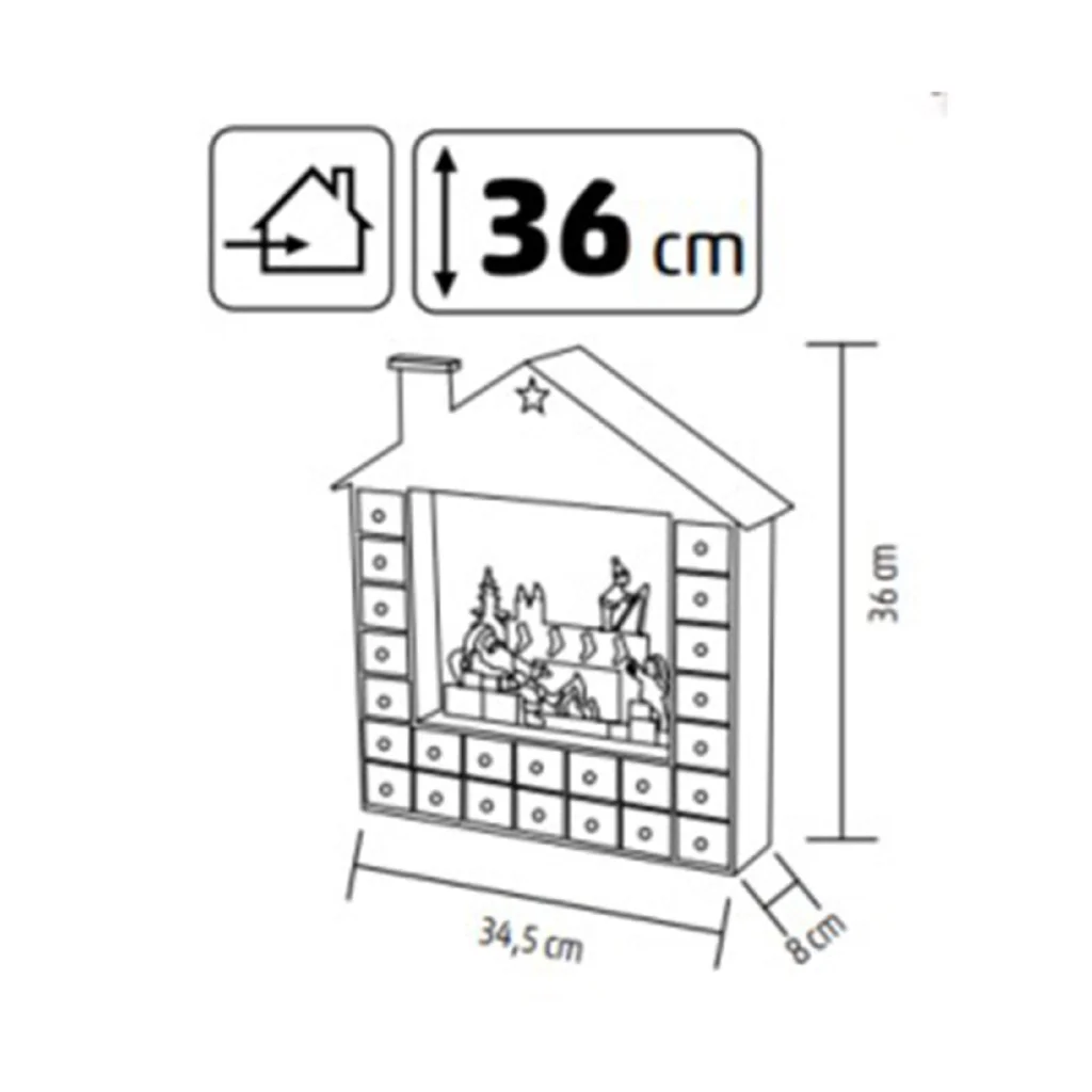 A 34,5 × 8 × 36 cm-es méret ideális a polcra, komódra vagy asztalra helyezve, anélkül hogy sok helyet foglalna. A LED világítás 2 db AAA elemmel működik (az elemek nem tartozékok), így a naptár bárhol könnyen elhelyezhető – nincs szükség konnektorra vagy kábelekre. Az elemes tápellátásnak köszönhetően biztonságos és mobilis használatot biztosít, különösen kisgyermekes otthonokban.