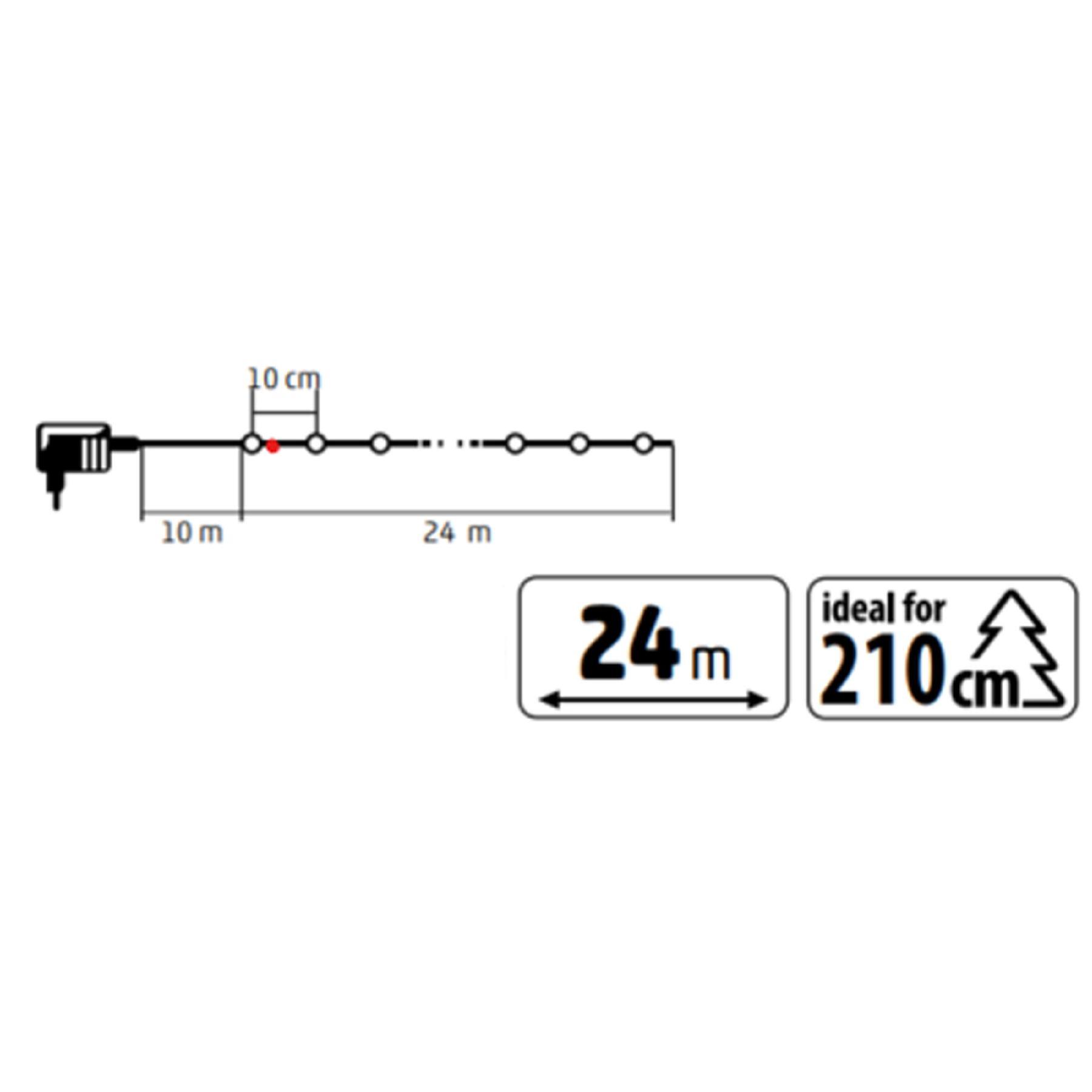 A fényfüzér teljes hossza 23,9 méter, amelyen 240 darab színes LED gondoskodik az egyenletes fényeloszlásról. A LED-ek 10 cm-es távolságban helyezkednek el egymástól, így a világítás sűrű, mégsem zavaró – ideális fa, erkélykorlát, kerítés vagy akár beltéri falak díszítésére is. A füzérhez tartozik egy 10 méter hosszú tápvezeték, amely lehetővé teszi a rugalmas és praktikus elhelyezést még távolabb eső csatlakozási pont esetén is.